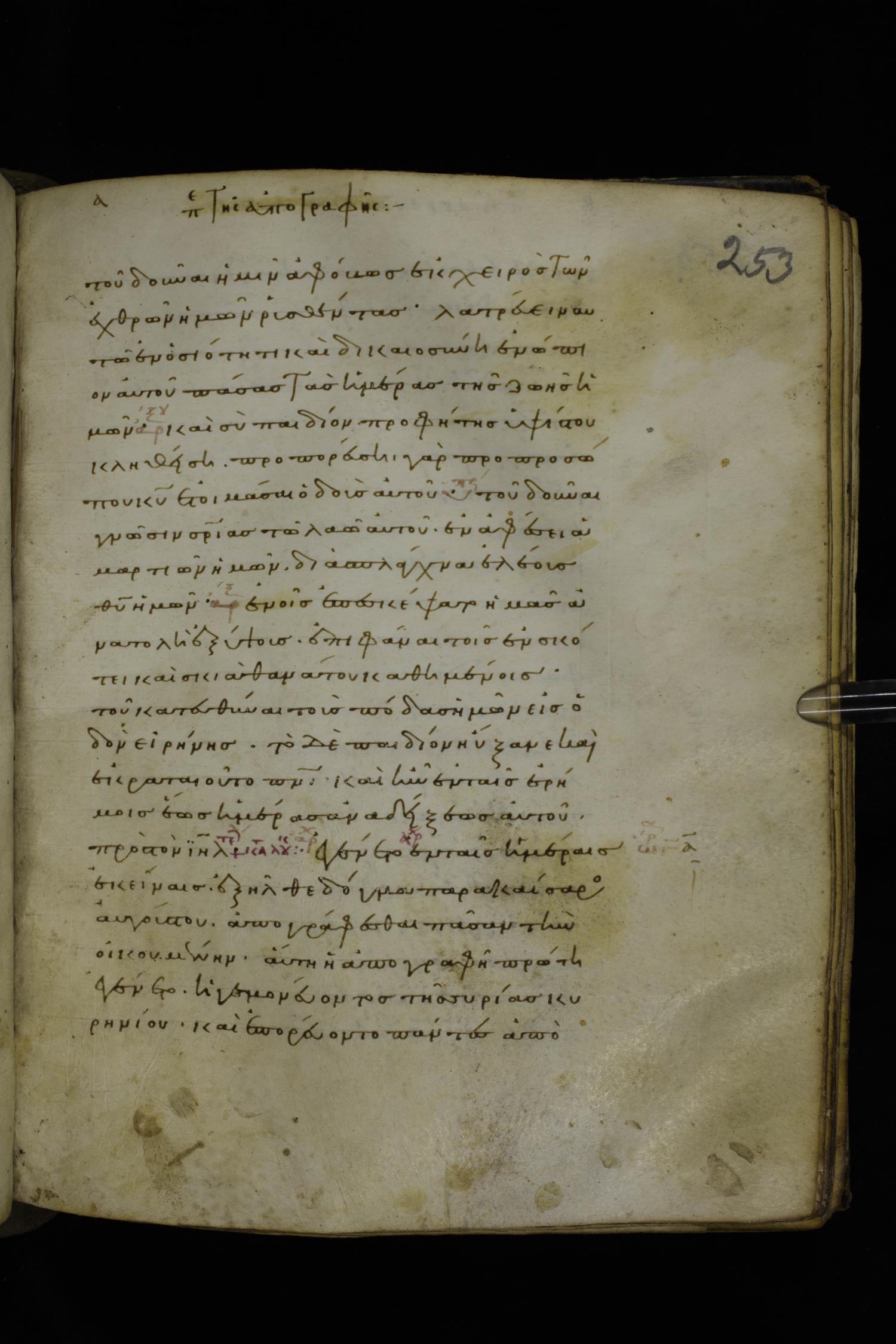 Eleventh century minuscule of the Gospels on parchment; 241 leaves, 1 column, 22 lines per column. Images were taken at the National Library of Greece in Athens.