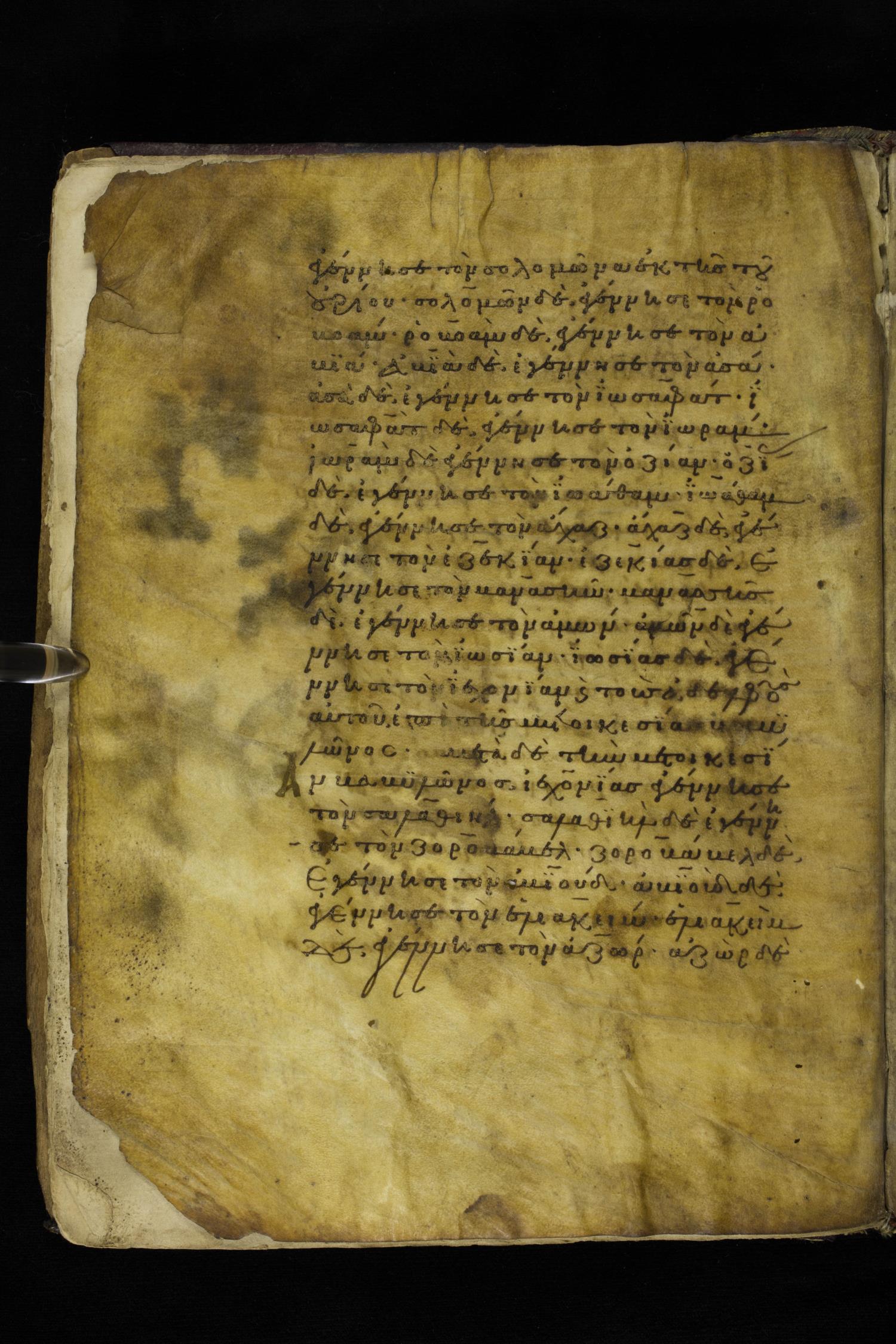 Twelfth century minuscule of the Gospels on parchment; 277 leaves, 1 column, 22 lines per column. Images were taken at the National Library of Greece in Athens.