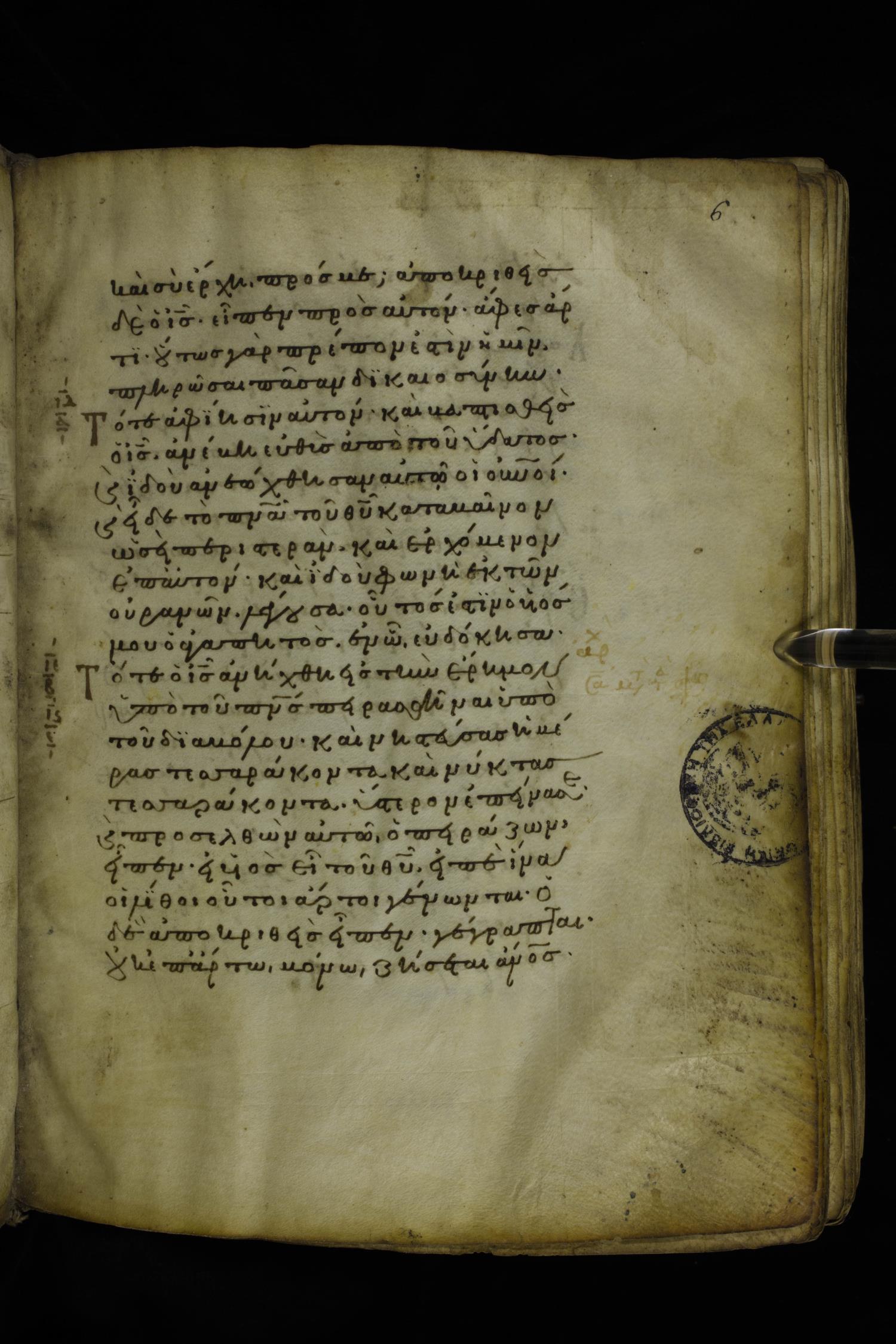 Twelfth century minuscule of the Gospels on parchment; 277 leaves, 1 column, 22 lines per column. Images were taken at the National Library of Greece in Athens.