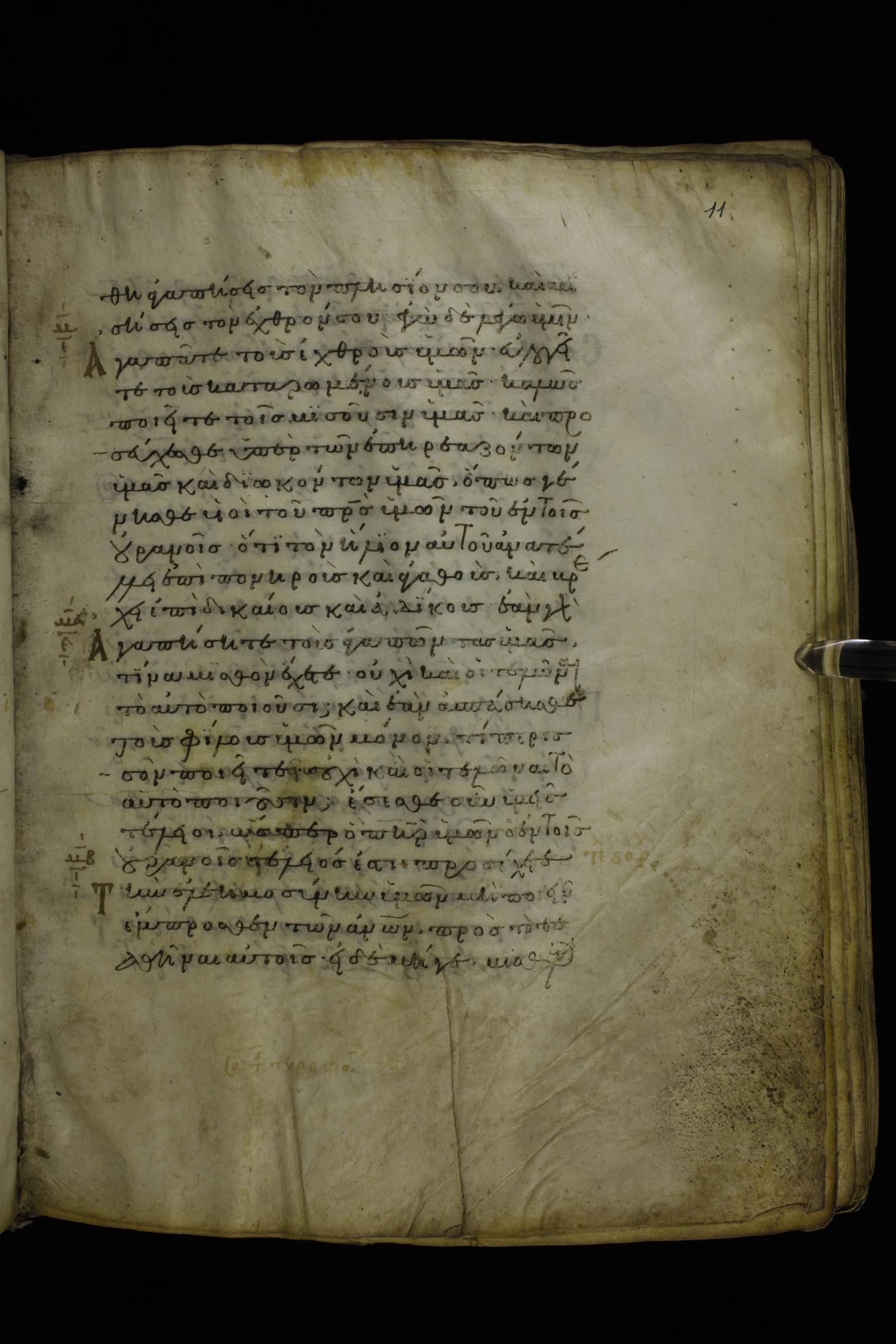 Twelfth century minuscule of the Gospels on parchment; 277 leaves, 1 column, 22 lines per column. Images were taken at the National Library of Greece in Athens.