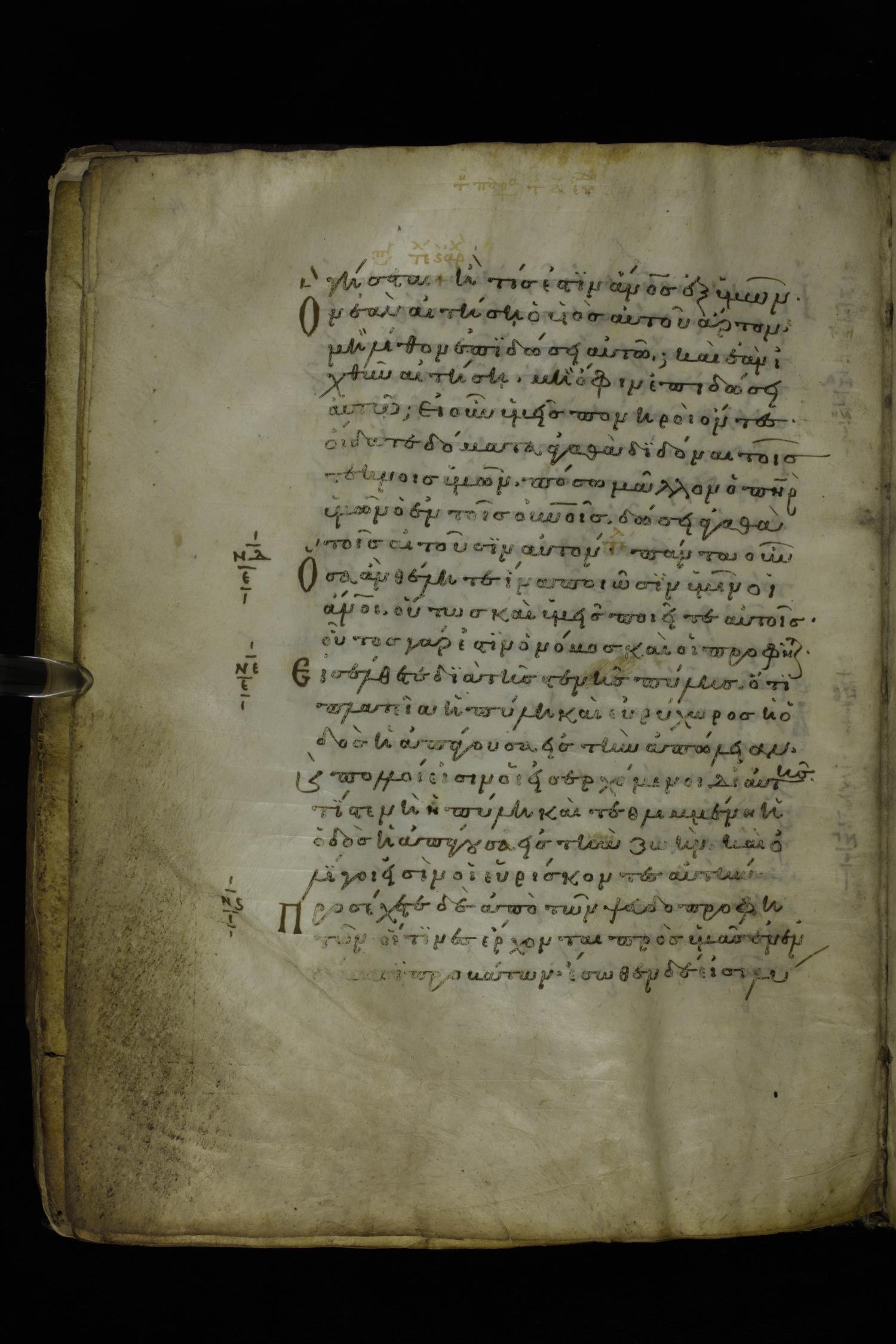 Twelfth century minuscule of the Gospels on parchment; 277 leaves, 1 column, 22 lines per column. Images were taken at the National Library of Greece in Athens.