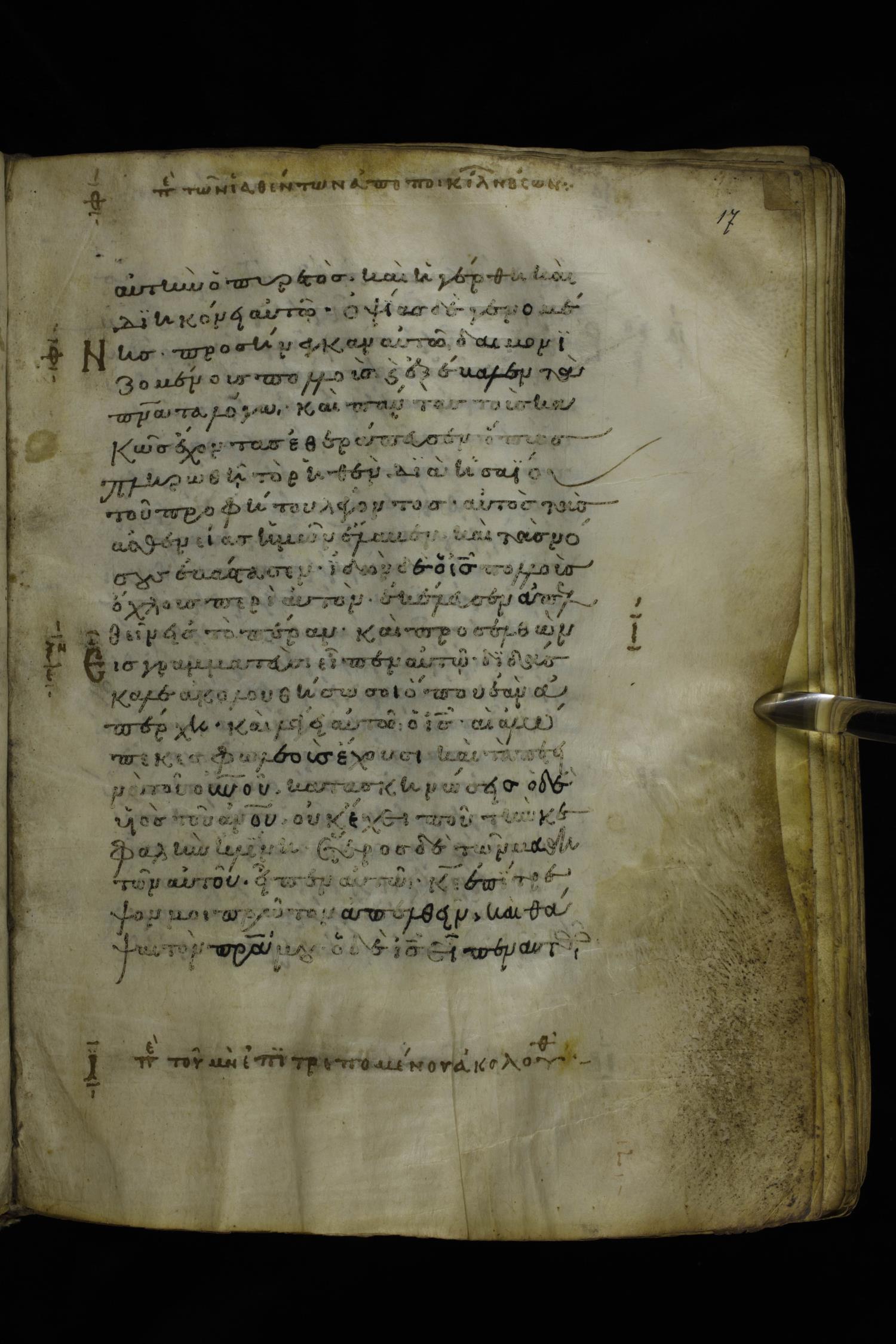 Twelfth century minuscule of the Gospels on parchment; 277 leaves, 1 column, 22 lines per column. Images were taken at the National Library of Greece in Athens.