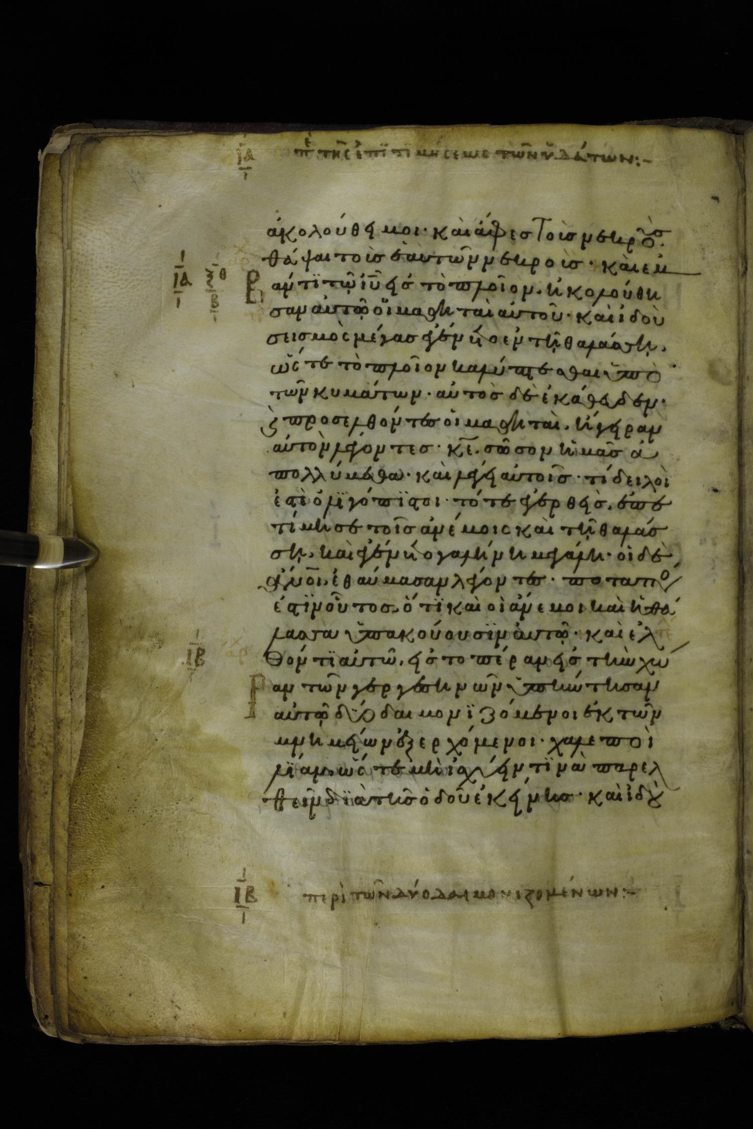 Twelfth century minuscule of the Gospels on parchment; 277 leaves, 1 column, 22 lines per column. Images were taken at the National Library of Greece in Athens.