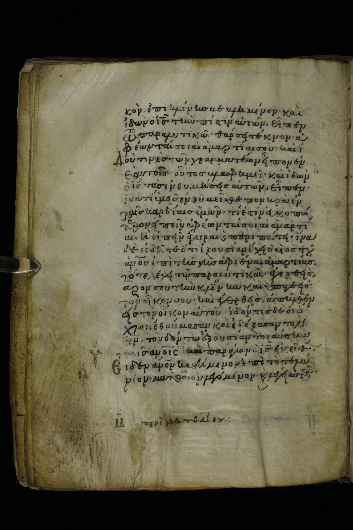 Twelfth century minuscule of the Gospels on parchment; 277 leaves, 1 column, 22 lines per column. Images were taken at the National Library of Greece in Athens.