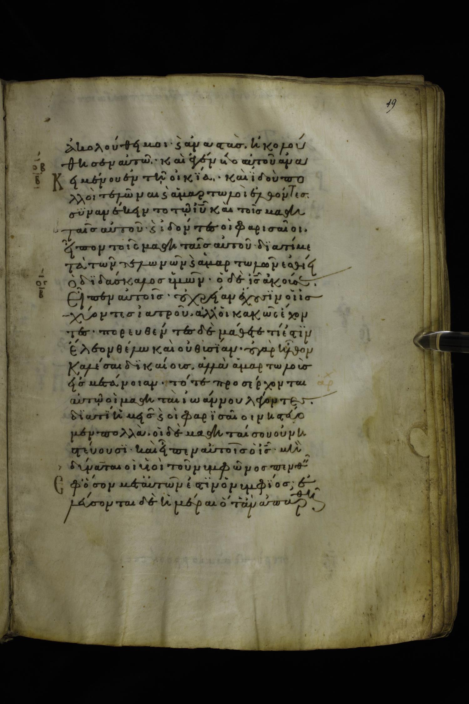 Twelfth century minuscule of the Gospels on parchment; 277 leaves, 1 column, 22 lines per column. Images were taken at the National Library of Greece in Athens.
