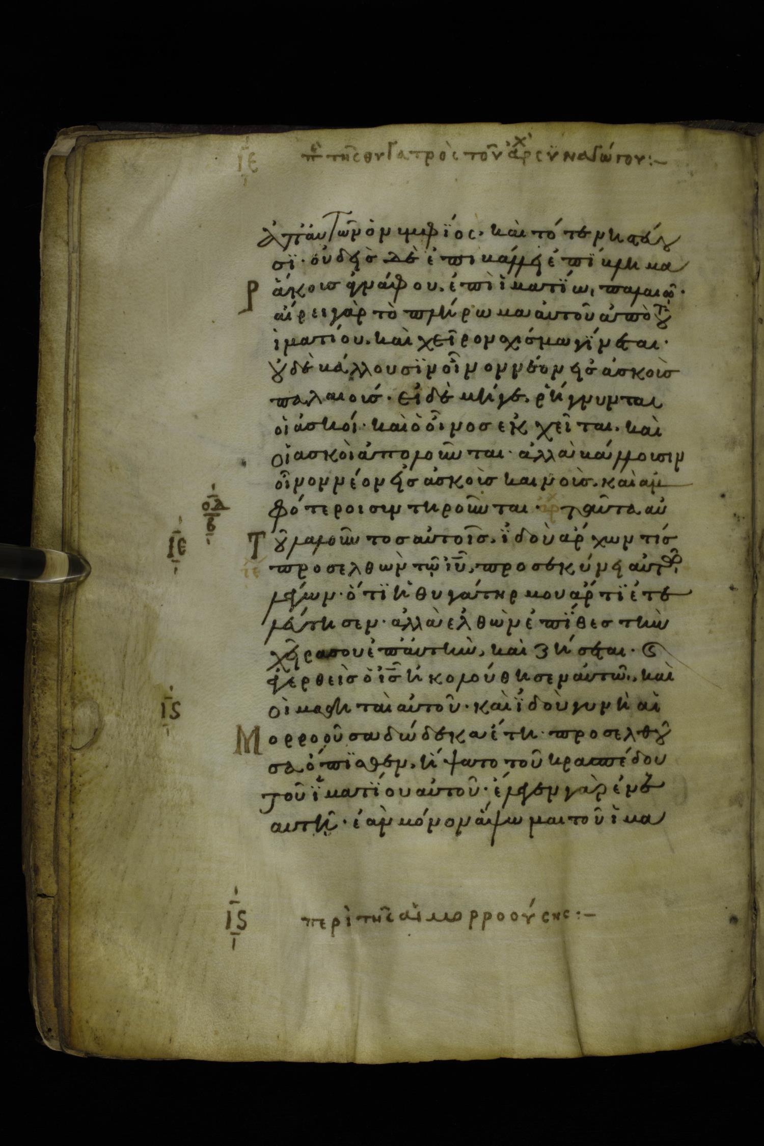 Twelfth century minuscule of the Gospels on parchment; 277 leaves, 1 column, 22 lines per column. Images were taken at the National Library of Greece in Athens.
