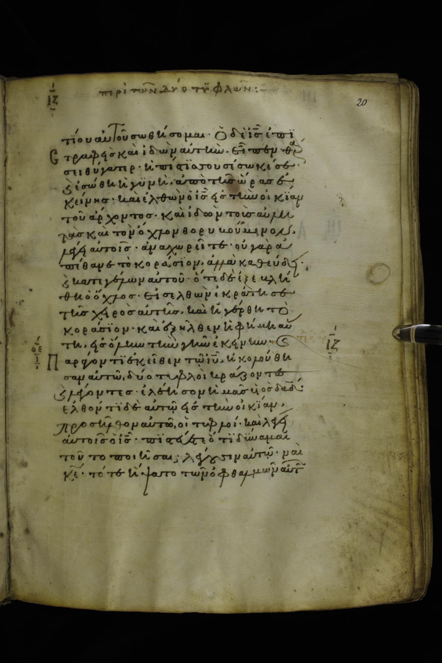 Twelfth century minuscule of the Gospels on parchment; 277 leaves, 1 column, 22 lines per column. Images were taken at the National Library of Greece in Athens.