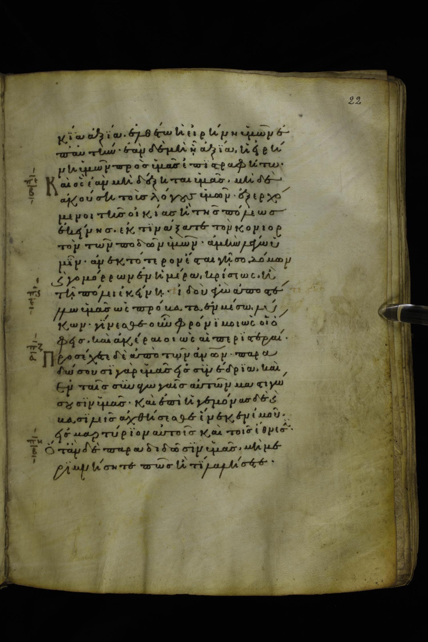 Twelfth century minuscule of the Gospels on parchment; 277 leaves, 1 column, 22 lines per column. Images were taken at the National Library of Greece in Athens.