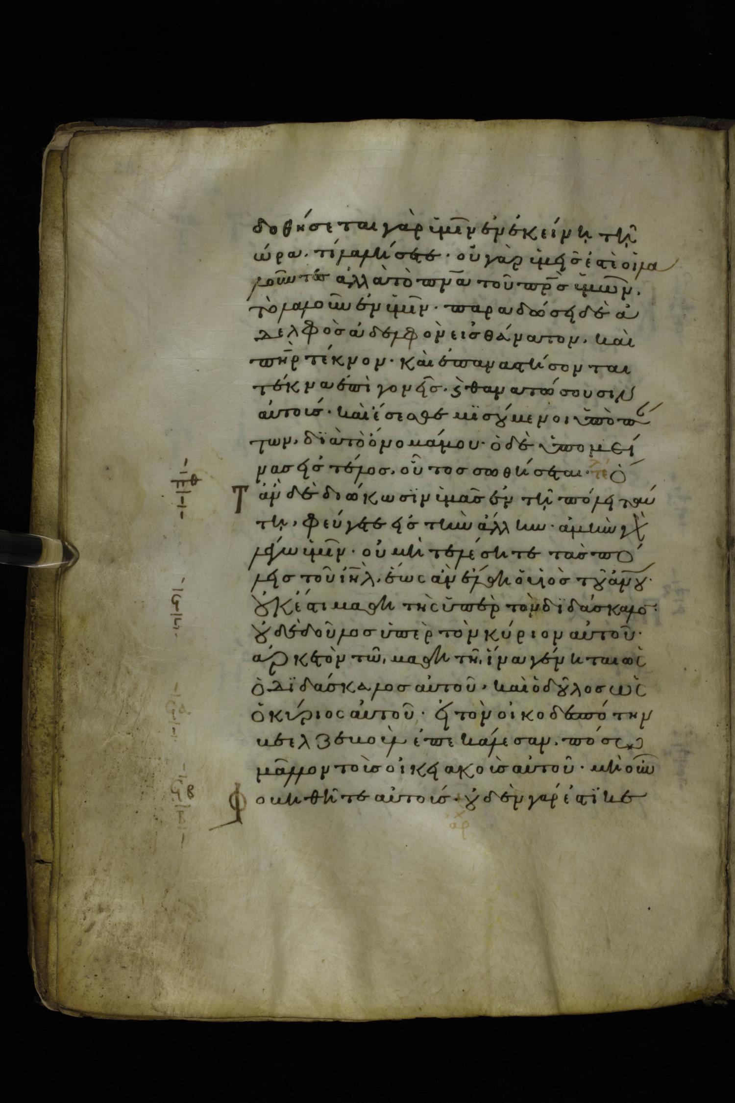 Twelfth century minuscule of the Gospels on parchment; 277 leaves, 1 column, 22 lines per column. Images were taken at the National Library of Greece in Athens.