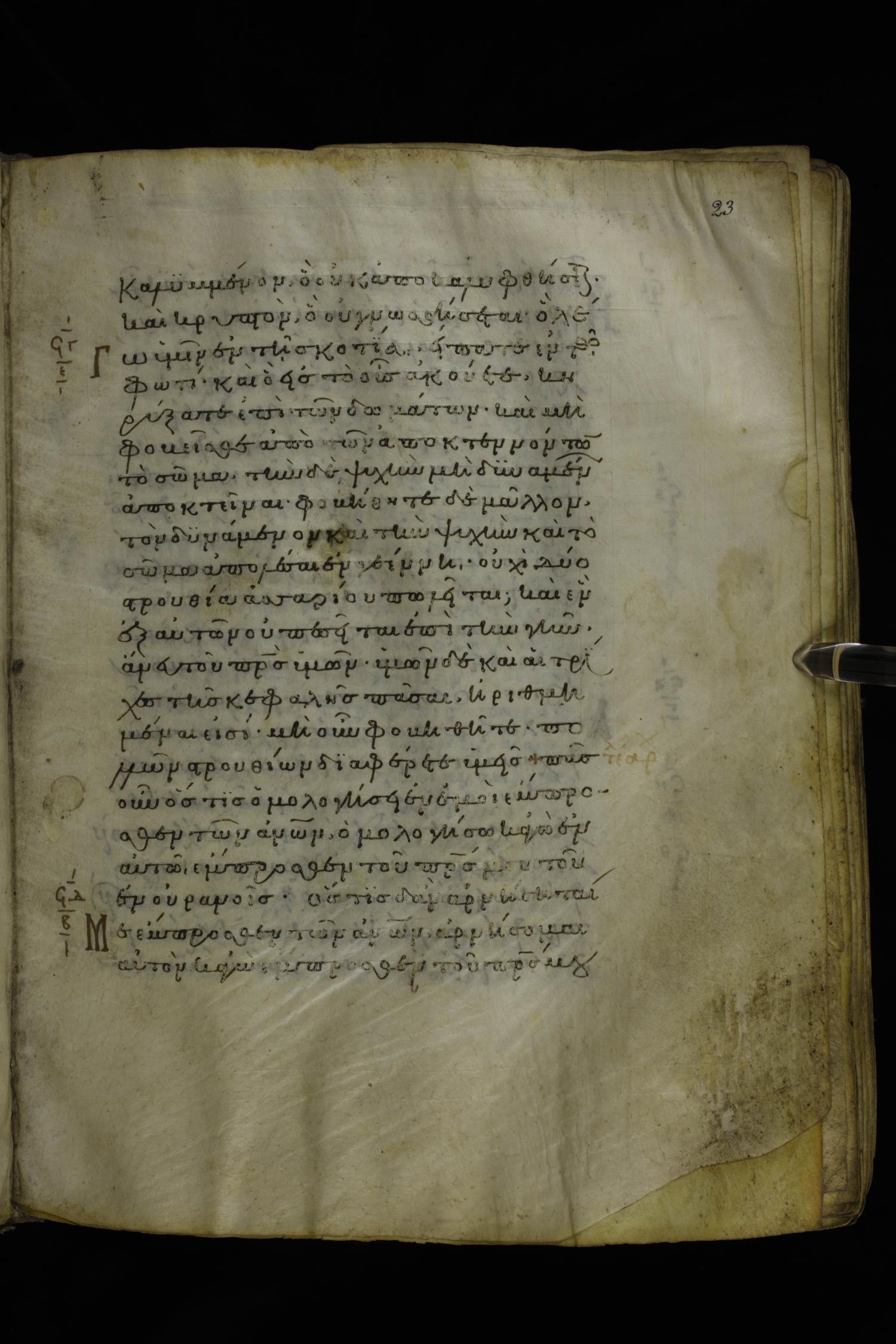 Twelfth century minuscule of the Gospels on parchment; 277 leaves, 1 column, 22 lines per column. Images were taken at the National Library of Greece in Athens.