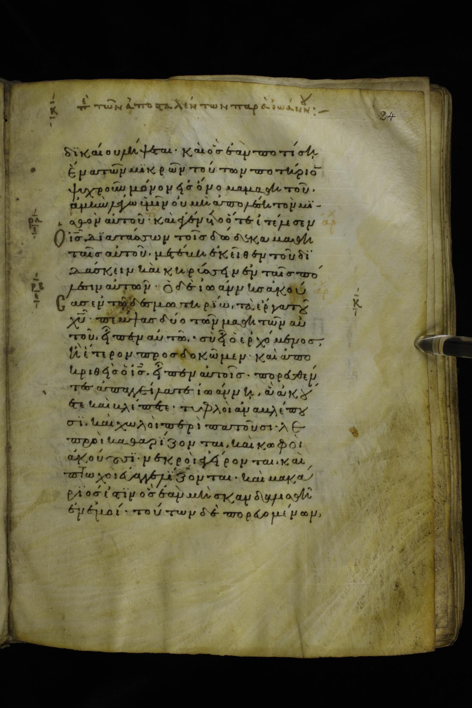 Twelfth century minuscule of the Gospels on parchment; 277 leaves, 1 column, 22 lines per column. Images were taken at the National Library of Greece in Athens.
