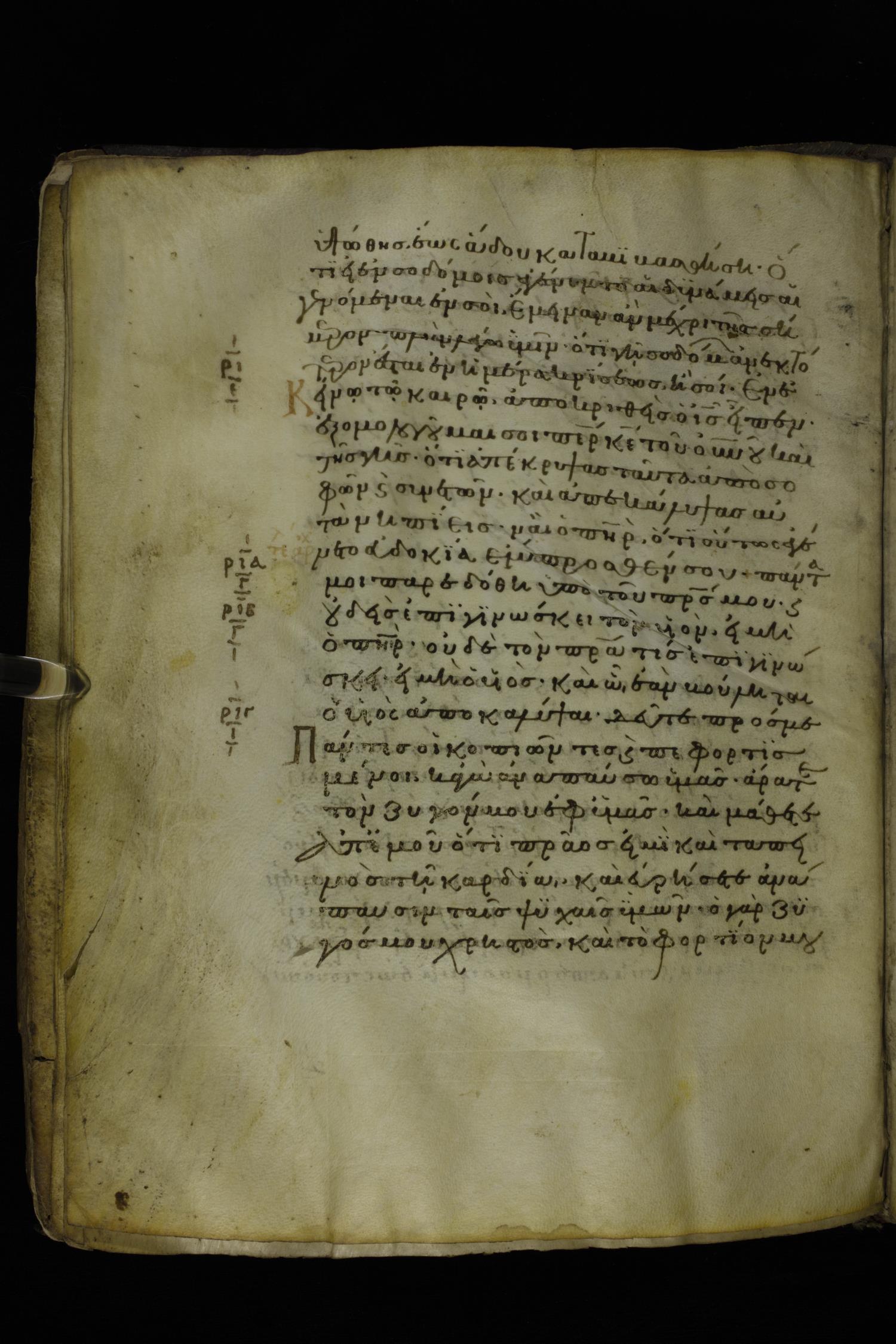 Twelfth century minuscule of the Gospels on parchment; 277 leaves, 1 column, 22 lines per column. Images were taken at the National Library of Greece in Athens.