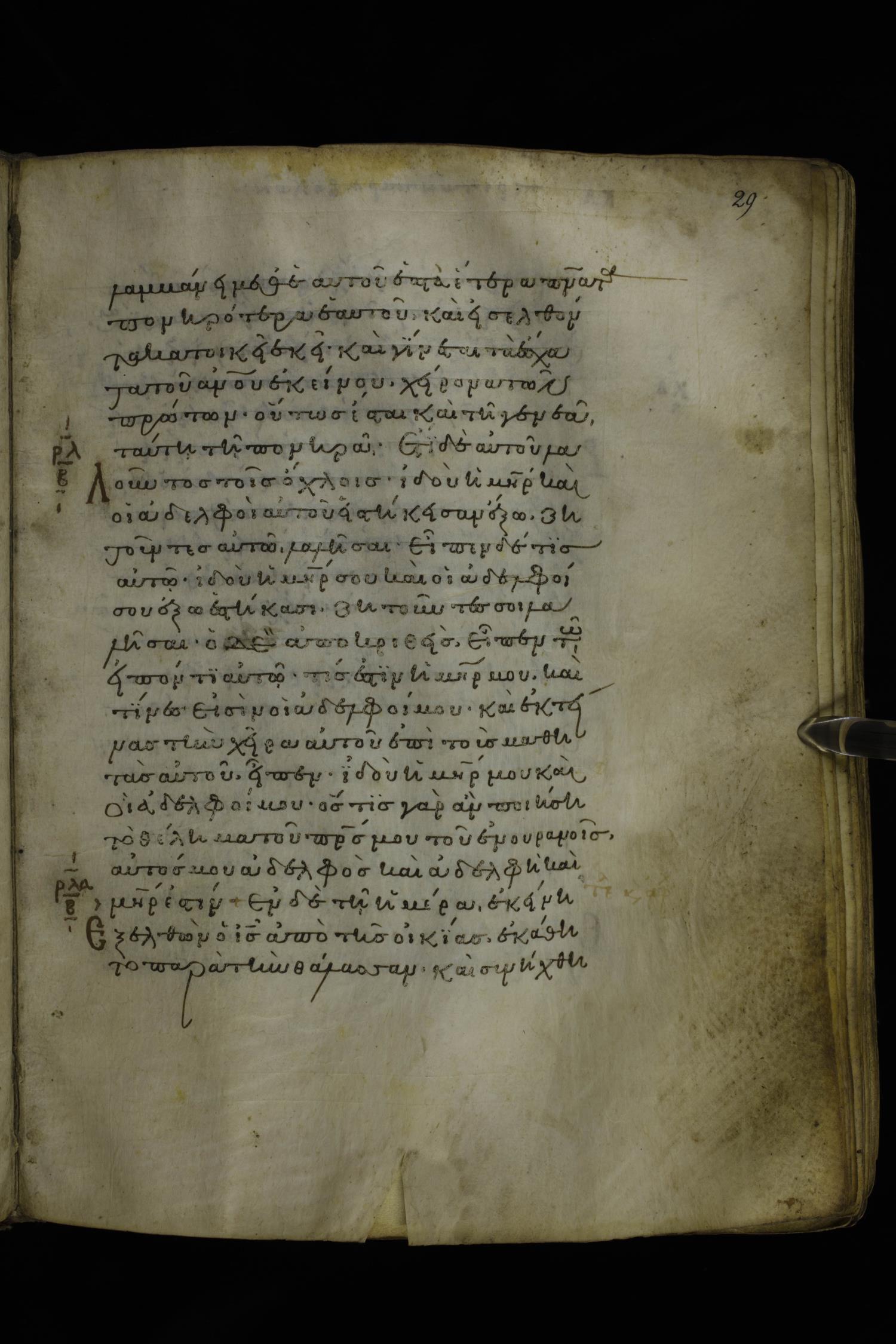 Twelfth century minuscule of the Gospels on parchment; 277 leaves, 1 column, 22 lines per column. Images were taken at the National Library of Greece in Athens.