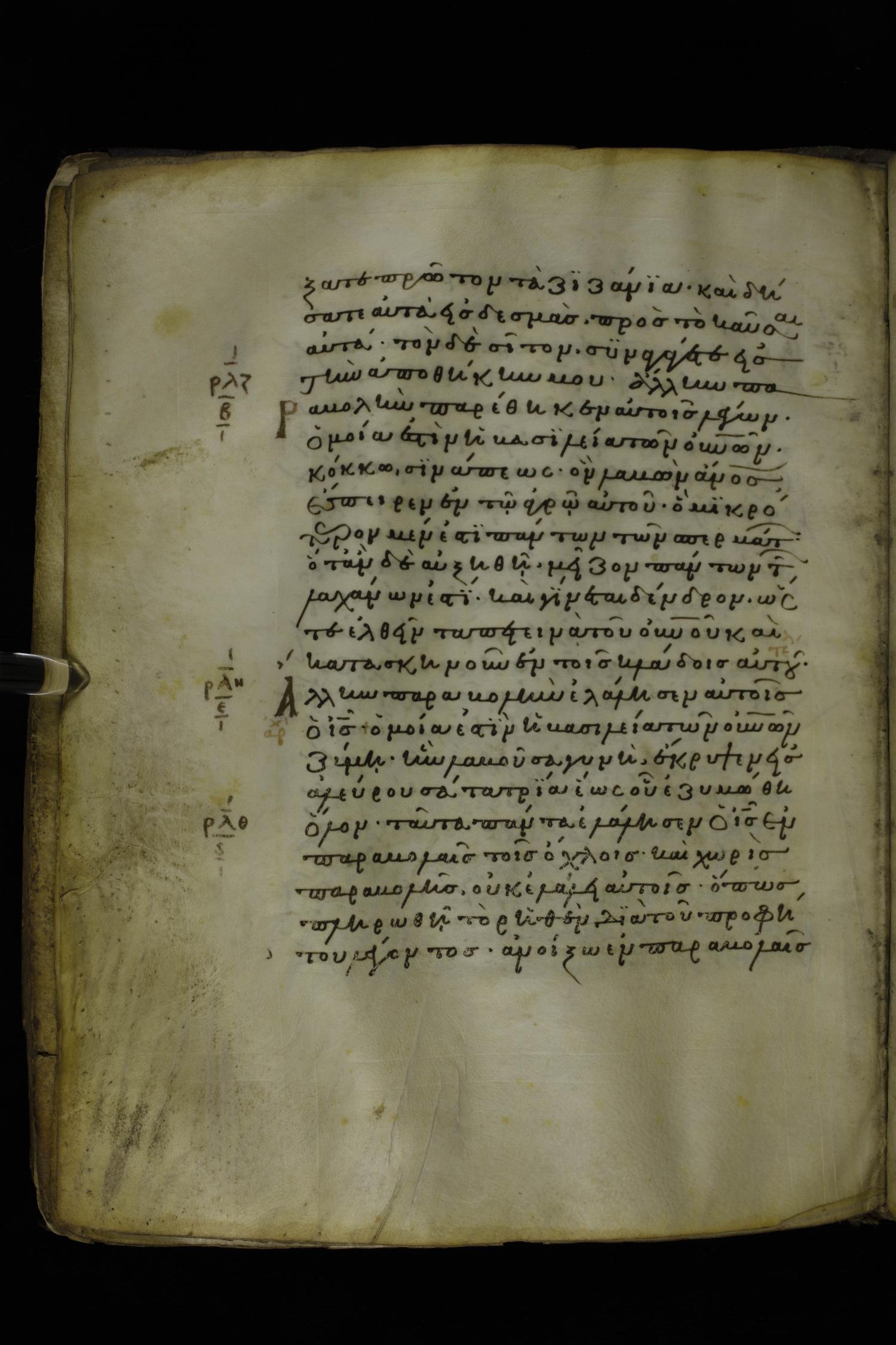 Twelfth century minuscule of the Gospels on parchment; 277 leaves, 1 column, 22 lines per column. Images were taken at the National Library of Greece in Athens.