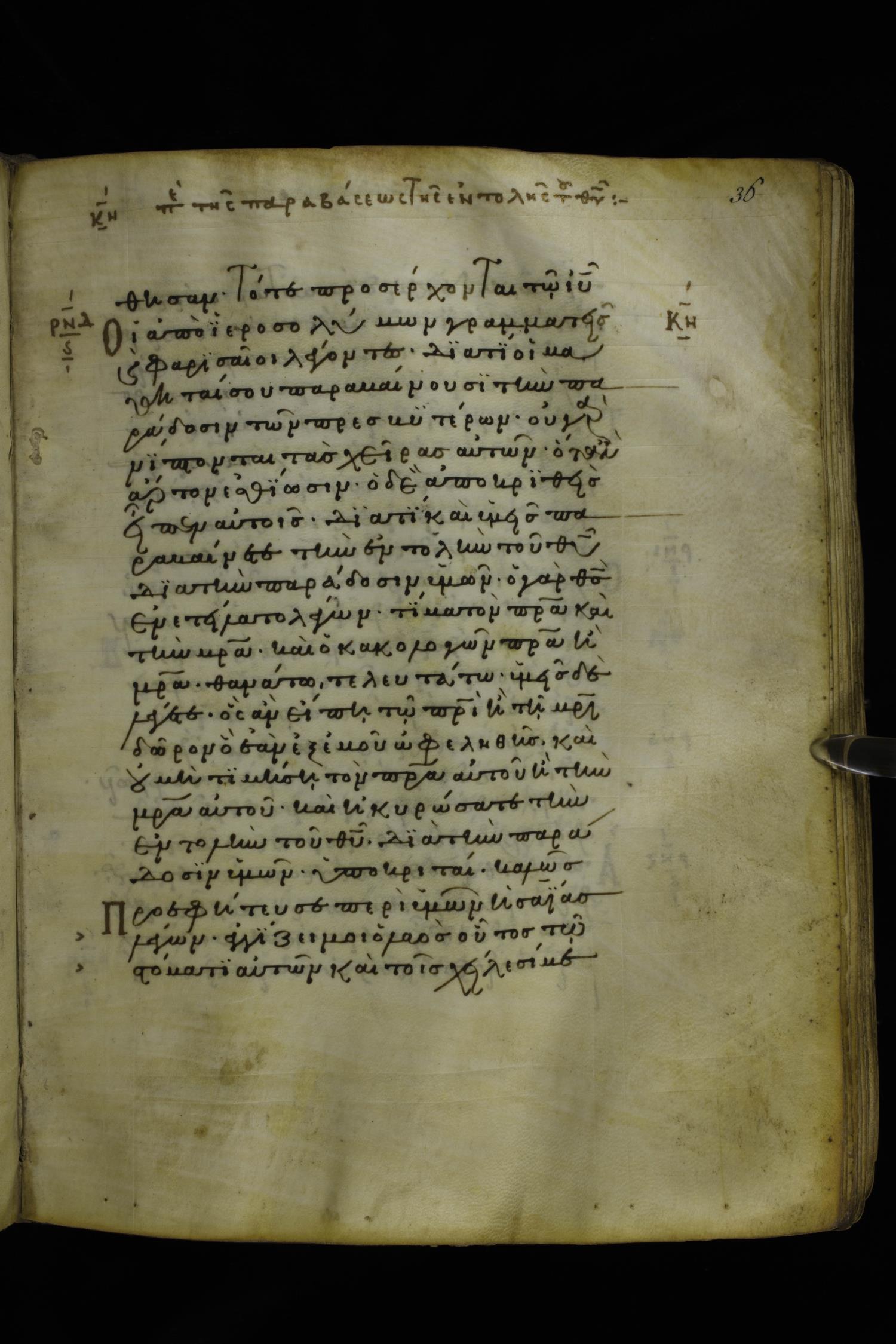 Twelfth century minuscule of the Gospels on parchment; 277 leaves, 1 column, 22 lines per column. Images were taken at the National Library of Greece in Athens.