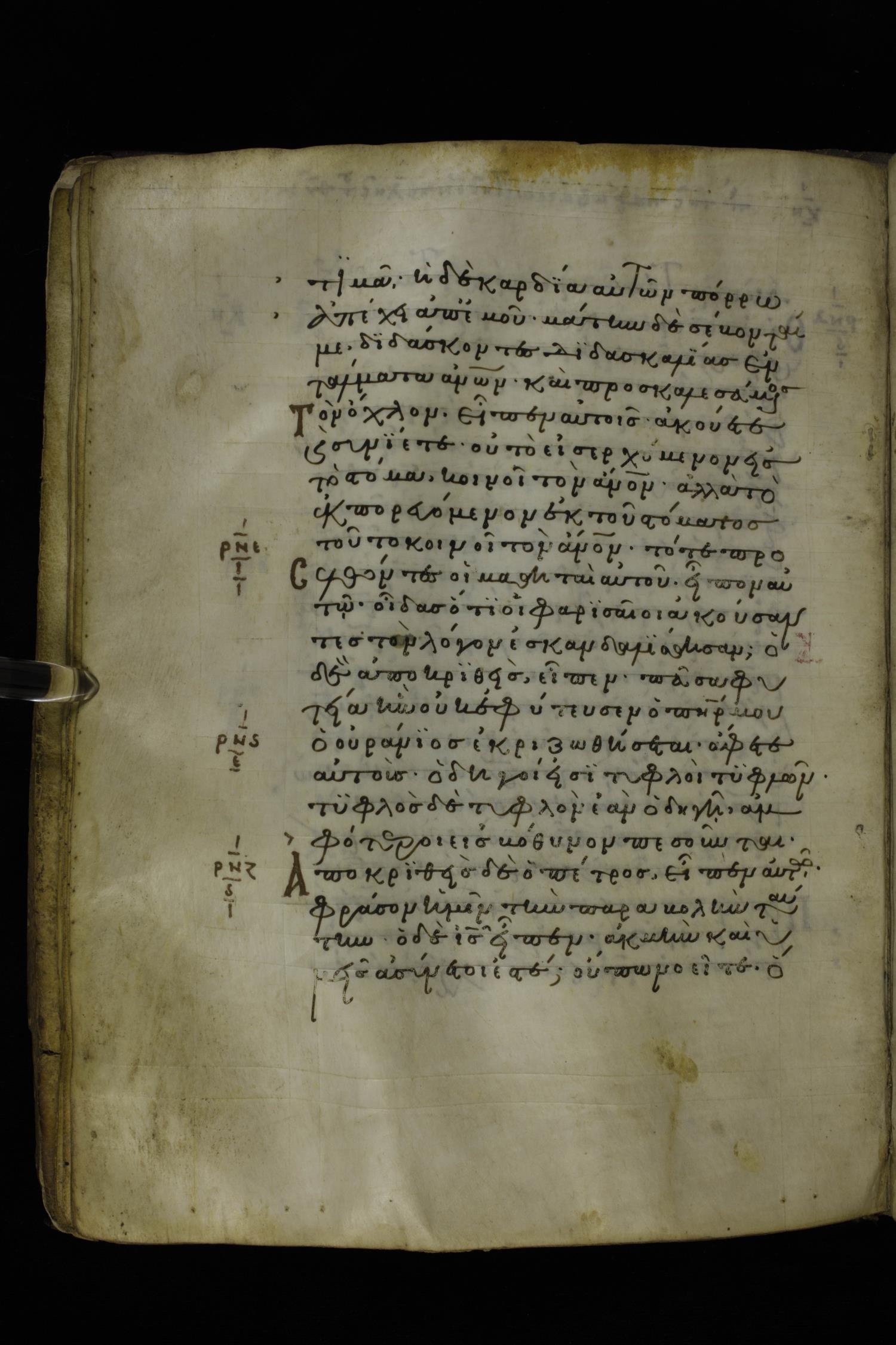 Twelfth century minuscule of the Gospels on parchment; 277 leaves, 1 column, 22 lines per column. Images were taken at the National Library of Greece in Athens.