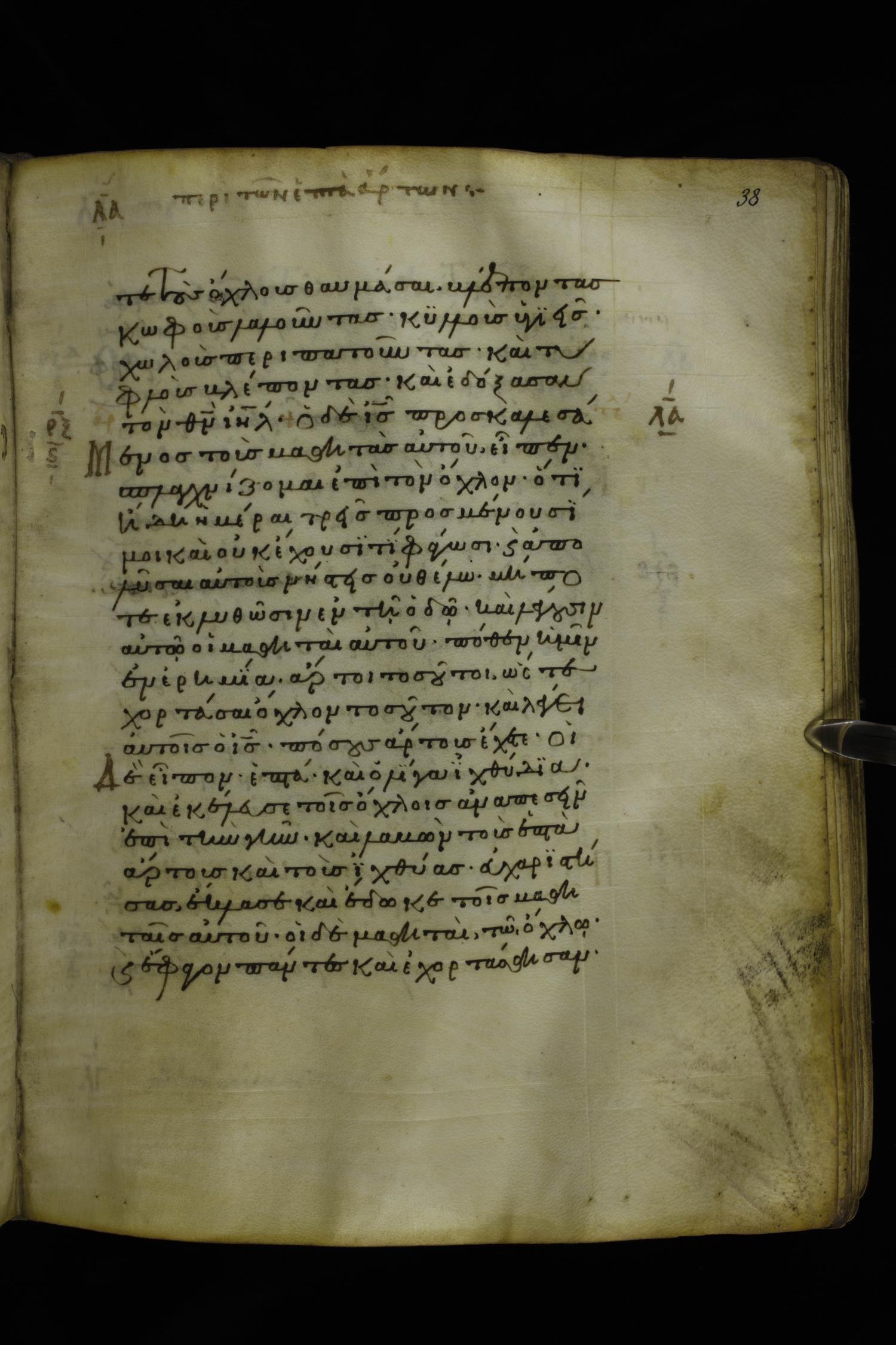 Twelfth century minuscule of the Gospels on parchment; 277 leaves, 1 column, 22 lines per column. Images were taken at the National Library of Greece in Athens.
