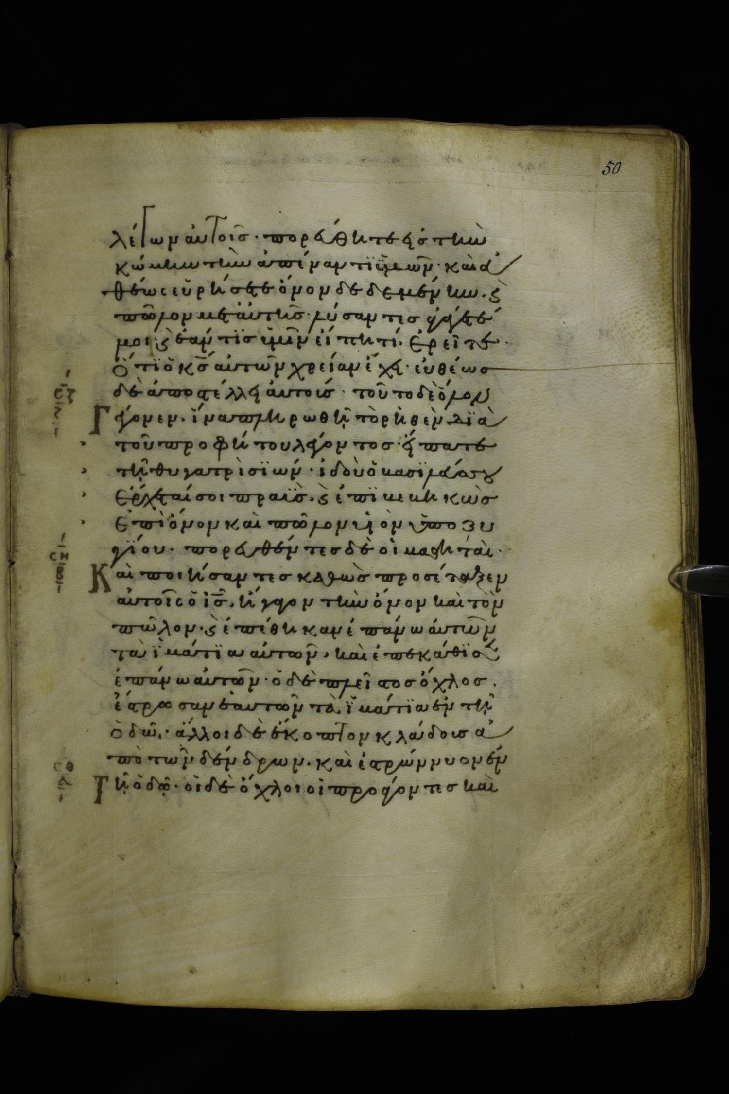 Twelfth century minuscule of the Gospels on parchment; 277 leaves, 1 column, 22 lines per column. Images were taken at the National Library of Greece in Athens.