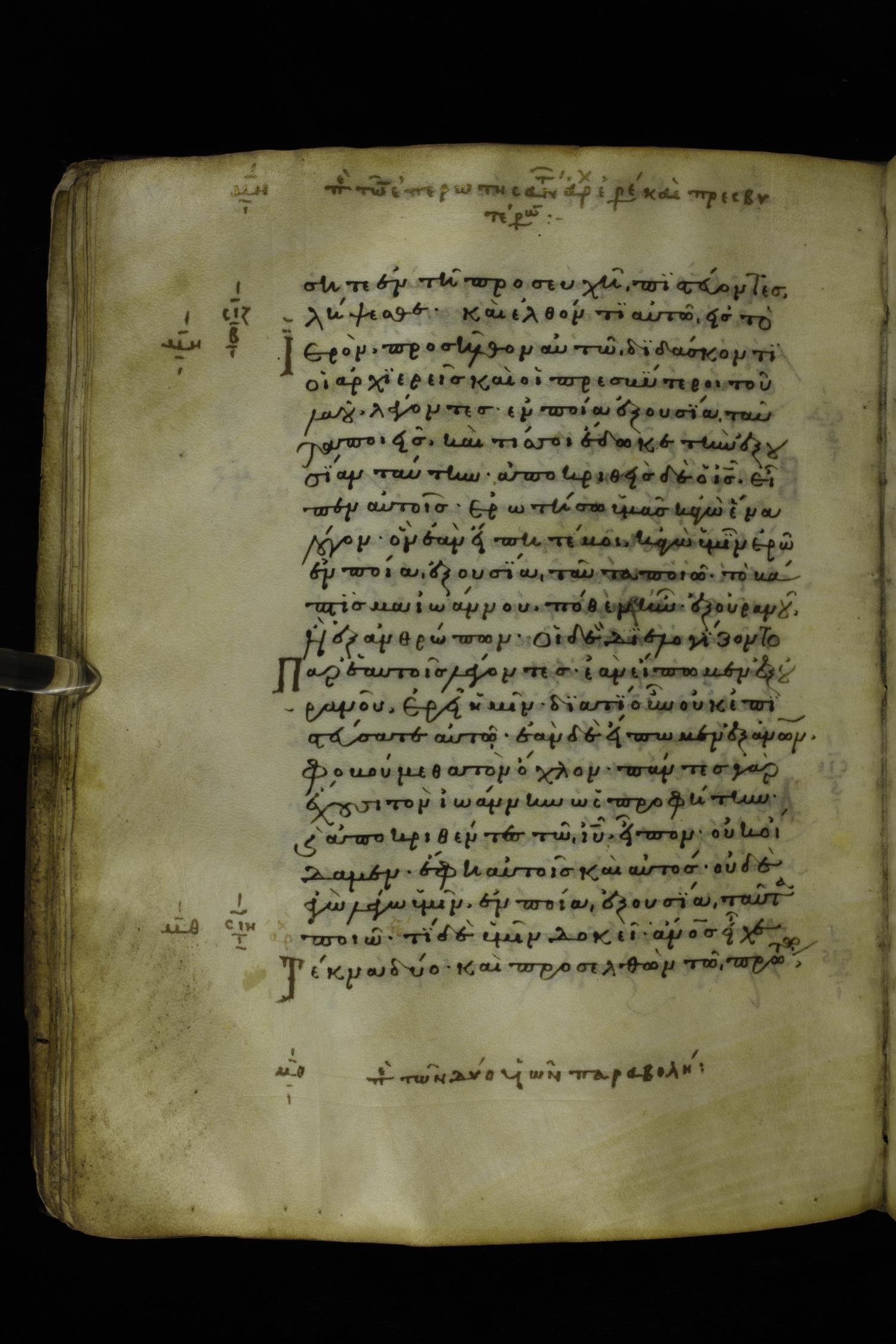 Twelfth century minuscule of the Gospels on parchment; 277 leaves, 1 column, 22 lines per column. Images were taken at the National Library of Greece in Athens.