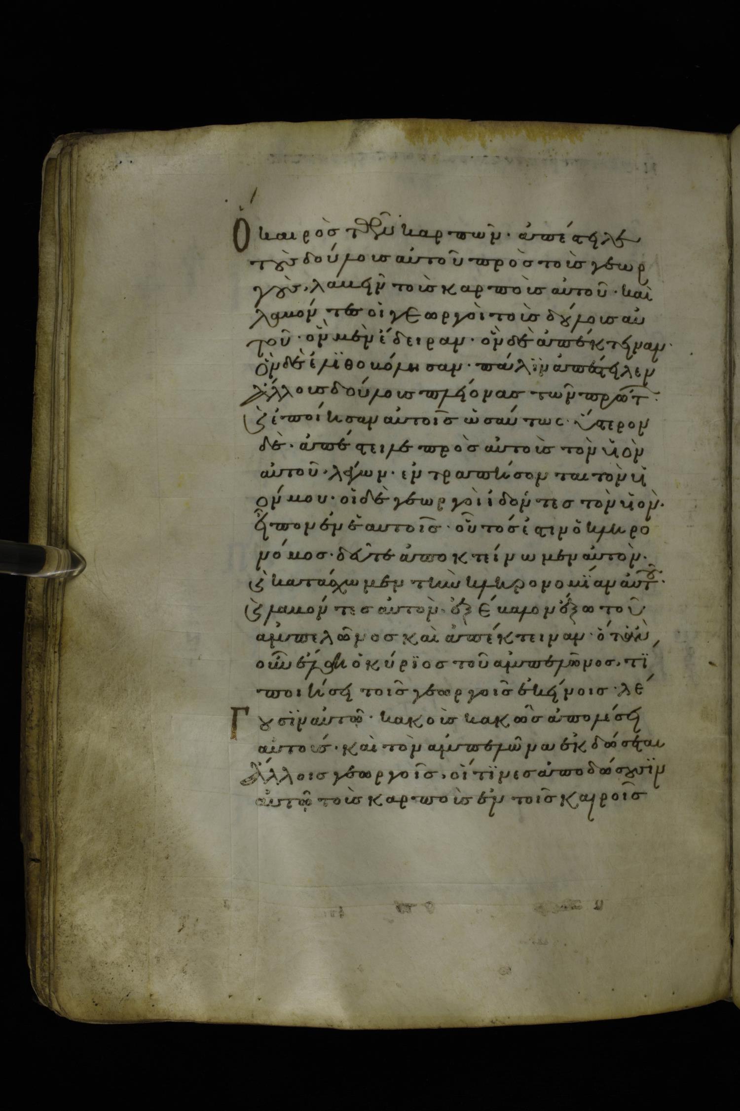 Twelfth century minuscule of the Gospels on parchment; 277 leaves, 1 column, 22 lines per column. Images were taken at the National Library of Greece in Athens.
