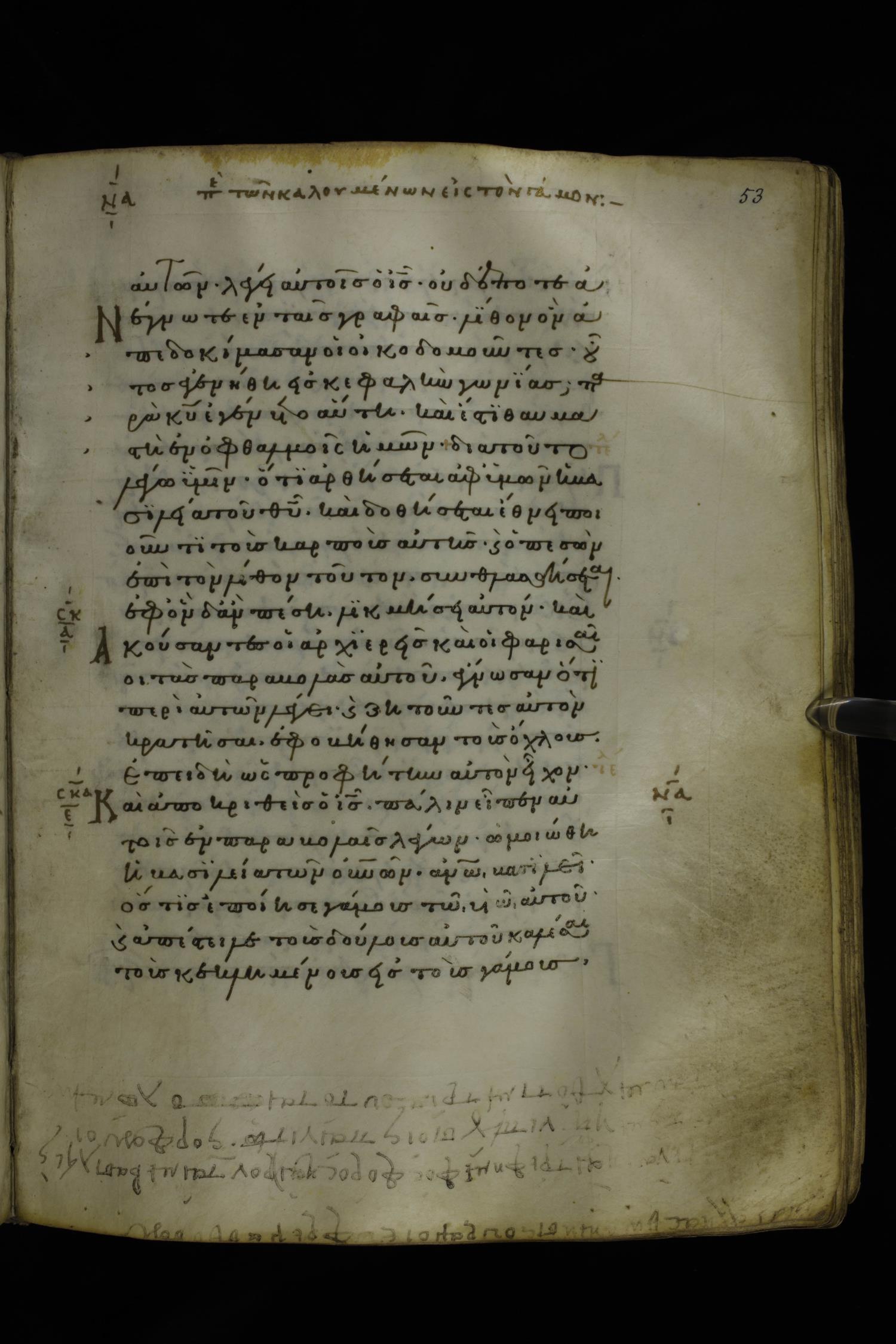 Twelfth century minuscule of the Gospels on parchment; 277 leaves, 1 column, 22 lines per column. Images were taken at the National Library of Greece in Athens.