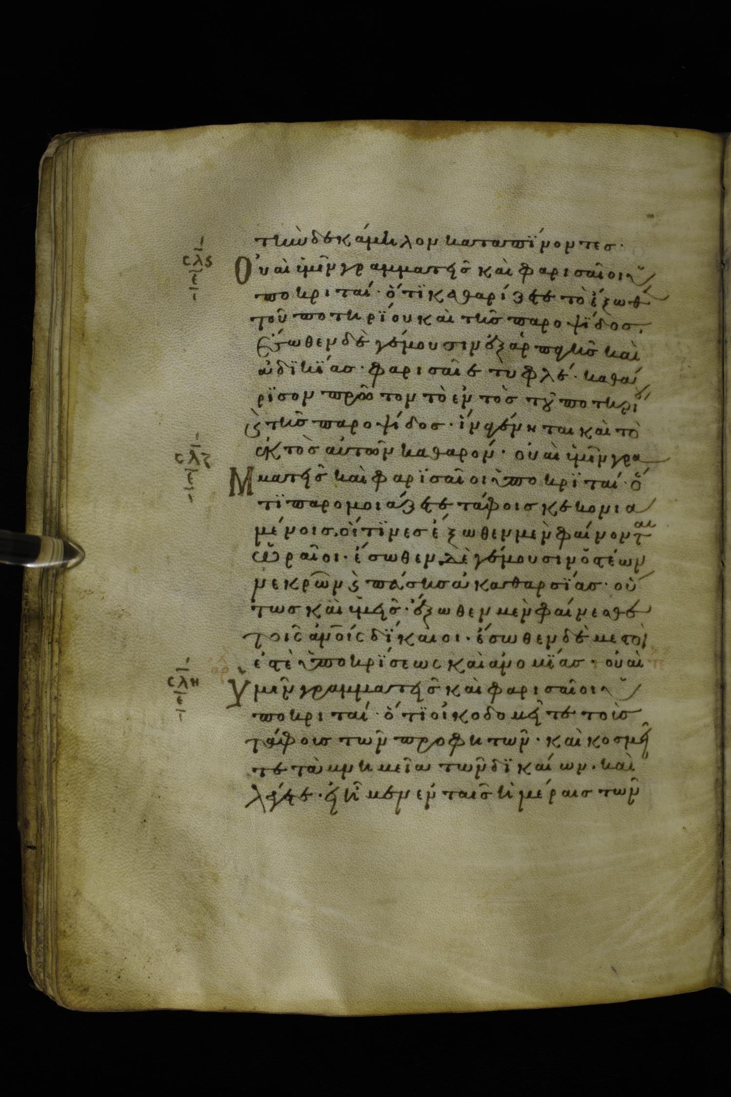 Twelfth century minuscule of the Gospels on parchment; 277 leaves, 1 column, 22 lines per column. Images were taken at the National Library of Greece in Athens.