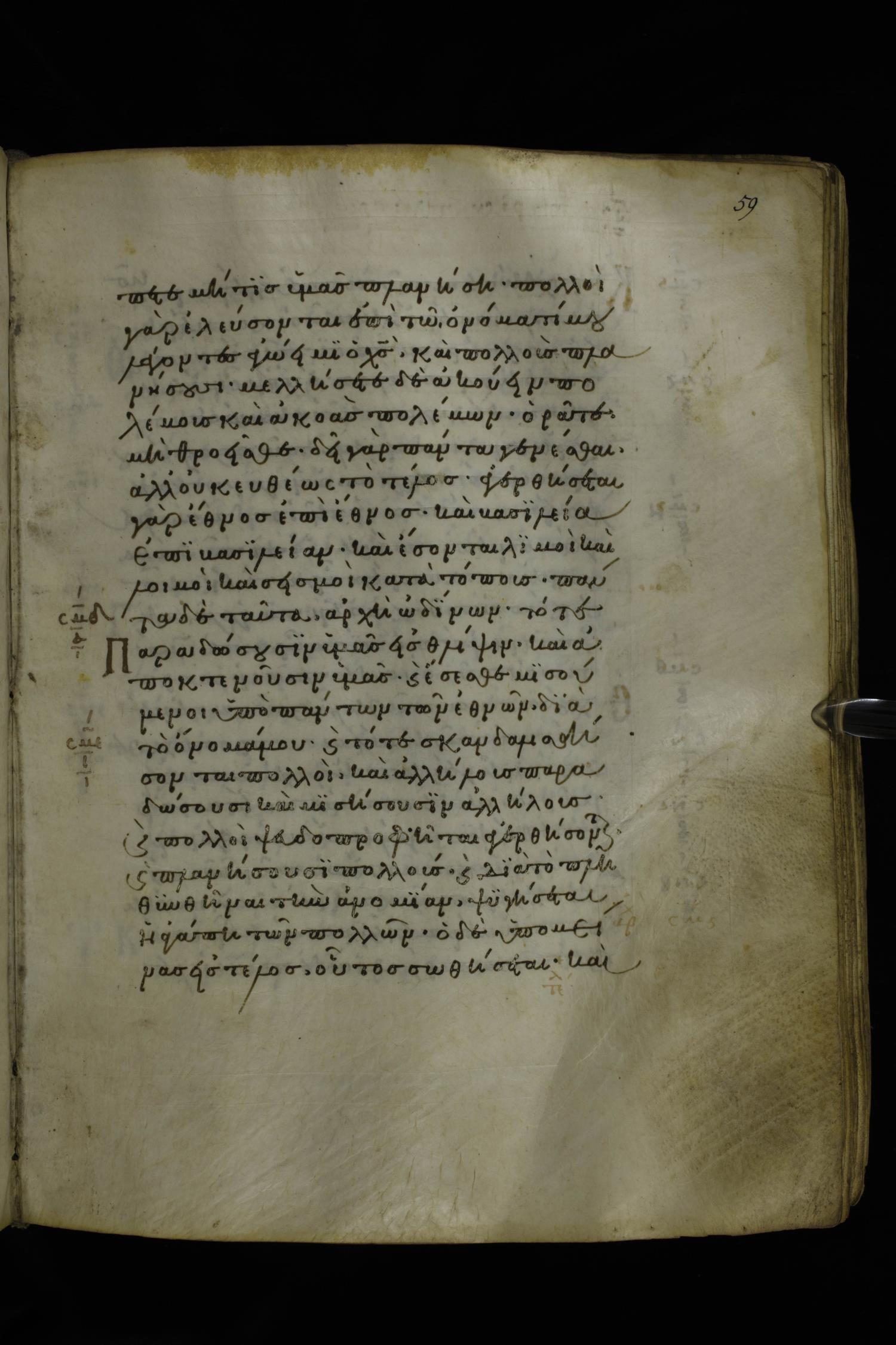 Twelfth century minuscule of the Gospels on parchment; 277 leaves, 1 column, 22 lines per column. Images were taken at the National Library of Greece in Athens.