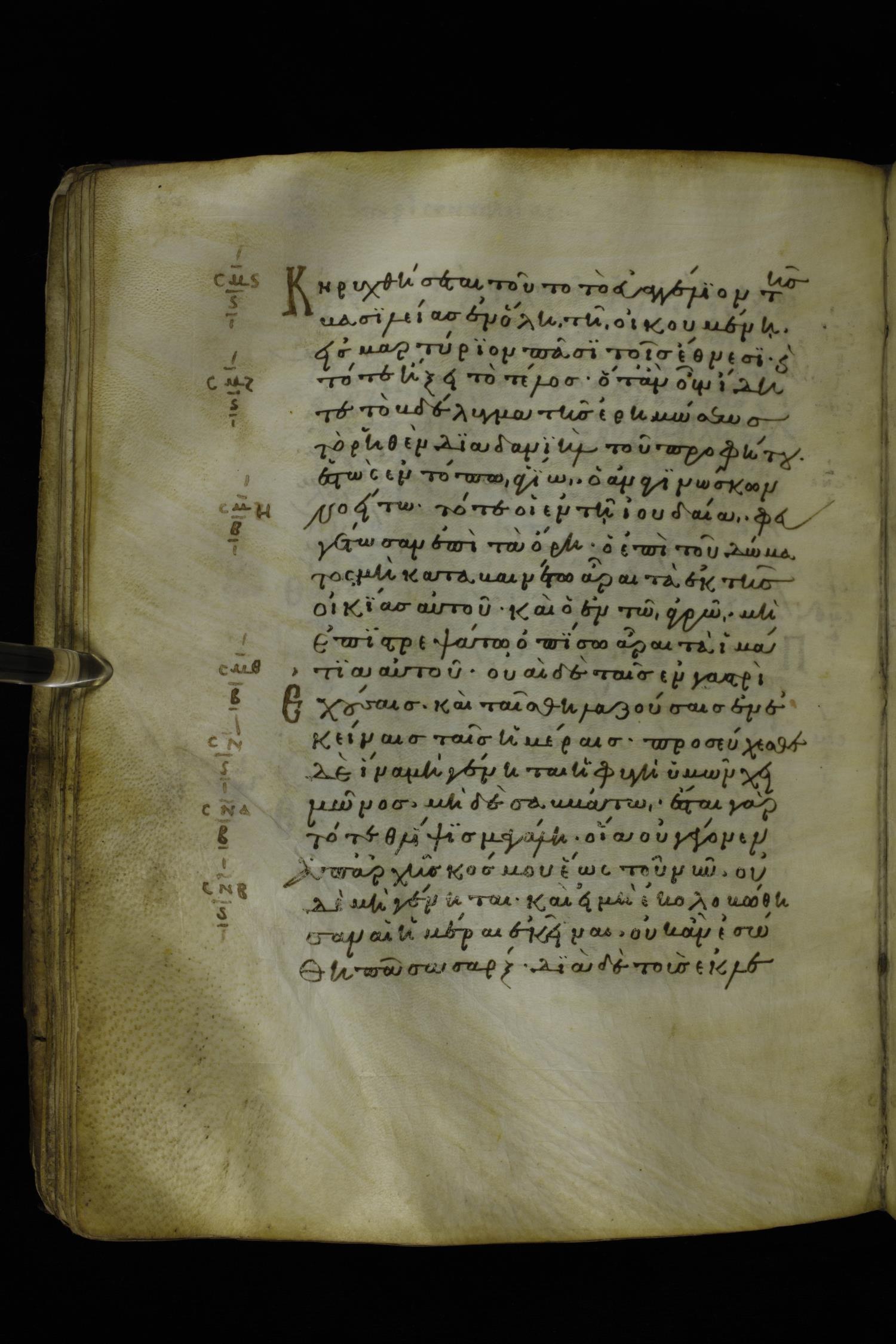 Twelfth century minuscule of the Gospels on parchment; 277 leaves, 1 column, 22 lines per column. Images were taken at the National Library of Greece in Athens.