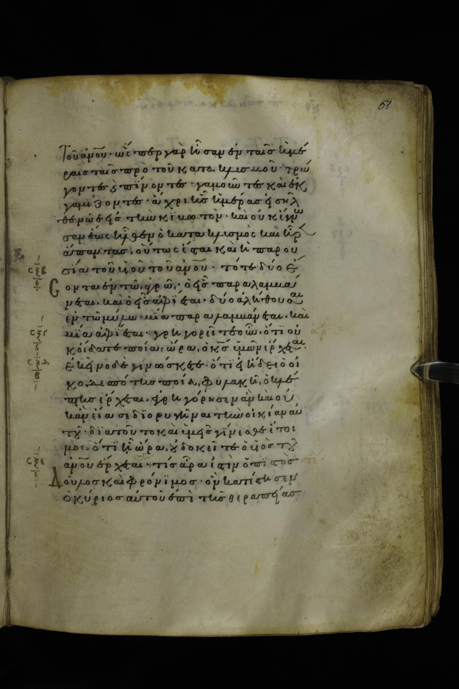Twelfth century minuscule of the Gospels on parchment; 277 leaves, 1 column, 22 lines per column. Images were taken at the National Library of Greece in Athens.