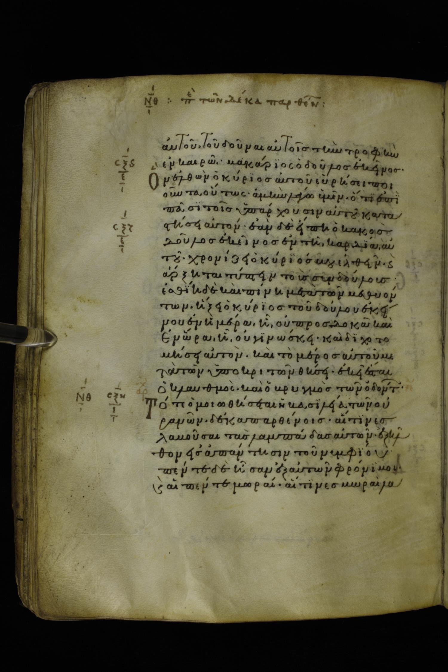 Twelfth century minuscule of the Gospels on parchment; 277 leaves, 1 column, 22 lines per column. Images were taken at the National Library of Greece in Athens.
