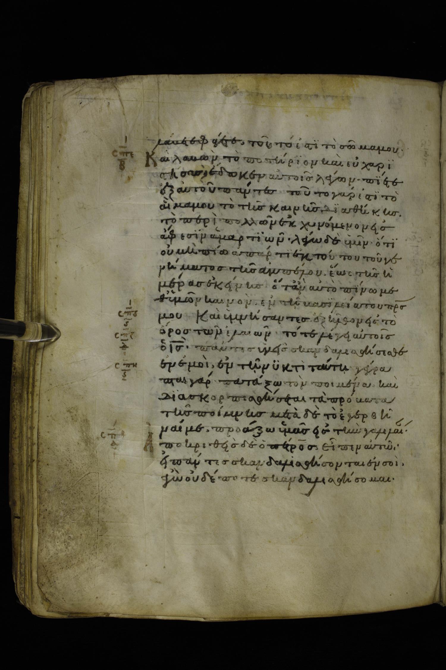 Twelfth century minuscule of the Gospels on parchment; 277 leaves, 1 column, 22 lines per column. Images were taken at the National Library of Greece in Athens.