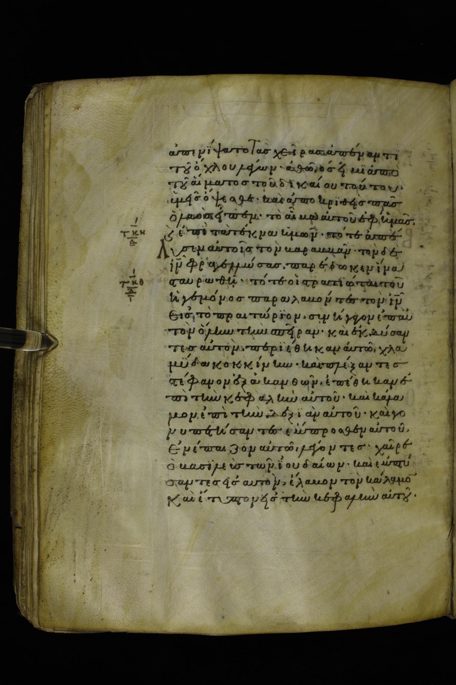 Twelfth century minuscule of the Gospels on parchment; 277 leaves, 1 column, 22 lines per column. Images were taken at the National Library of Greece in Athens.