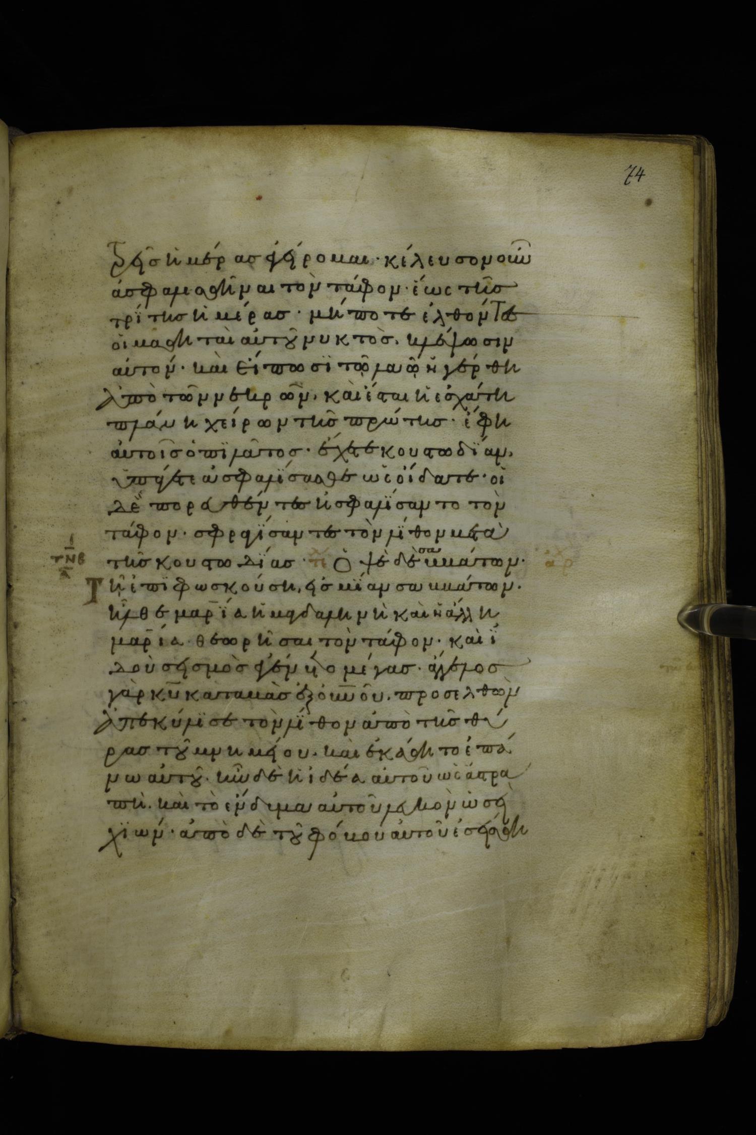 Twelfth century minuscule of the Gospels on parchment; 277 leaves, 1 column, 22 lines per column. Images were taken at the National Library of Greece in Athens.