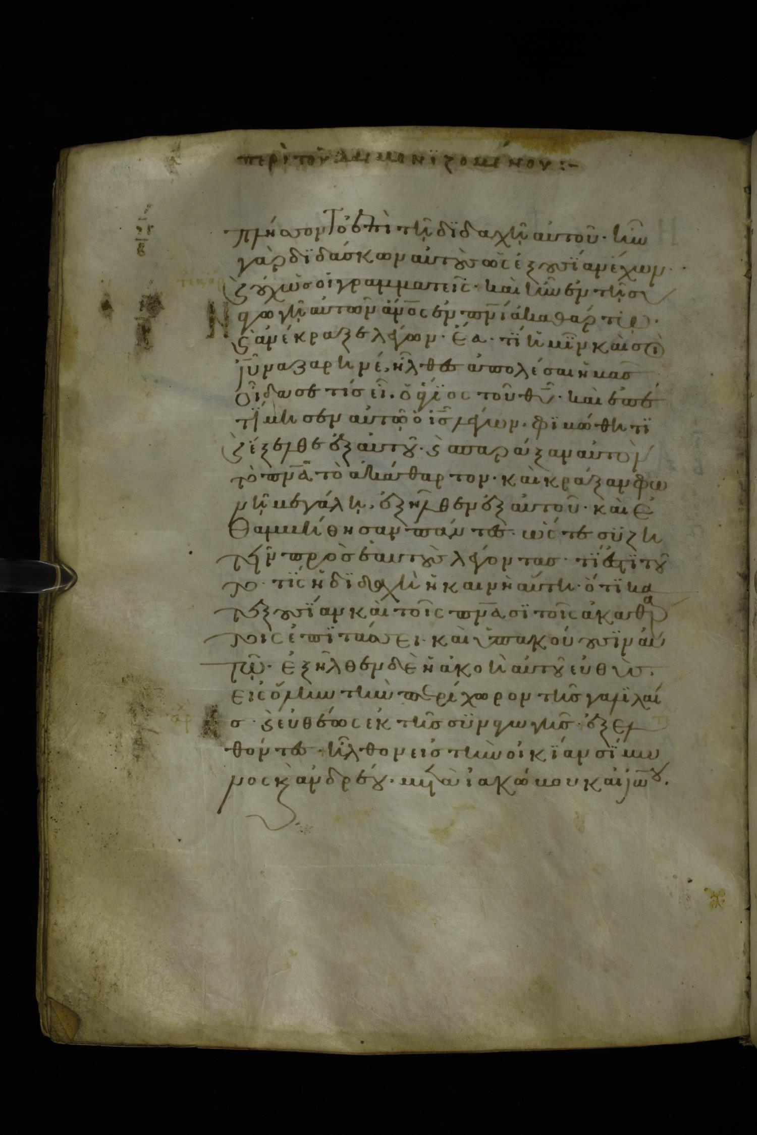 Twelfth century minuscule of the Gospels on parchment; 277 leaves, 1 column, 22 lines per column. Images were taken at the National Library of Greece in Athens.
