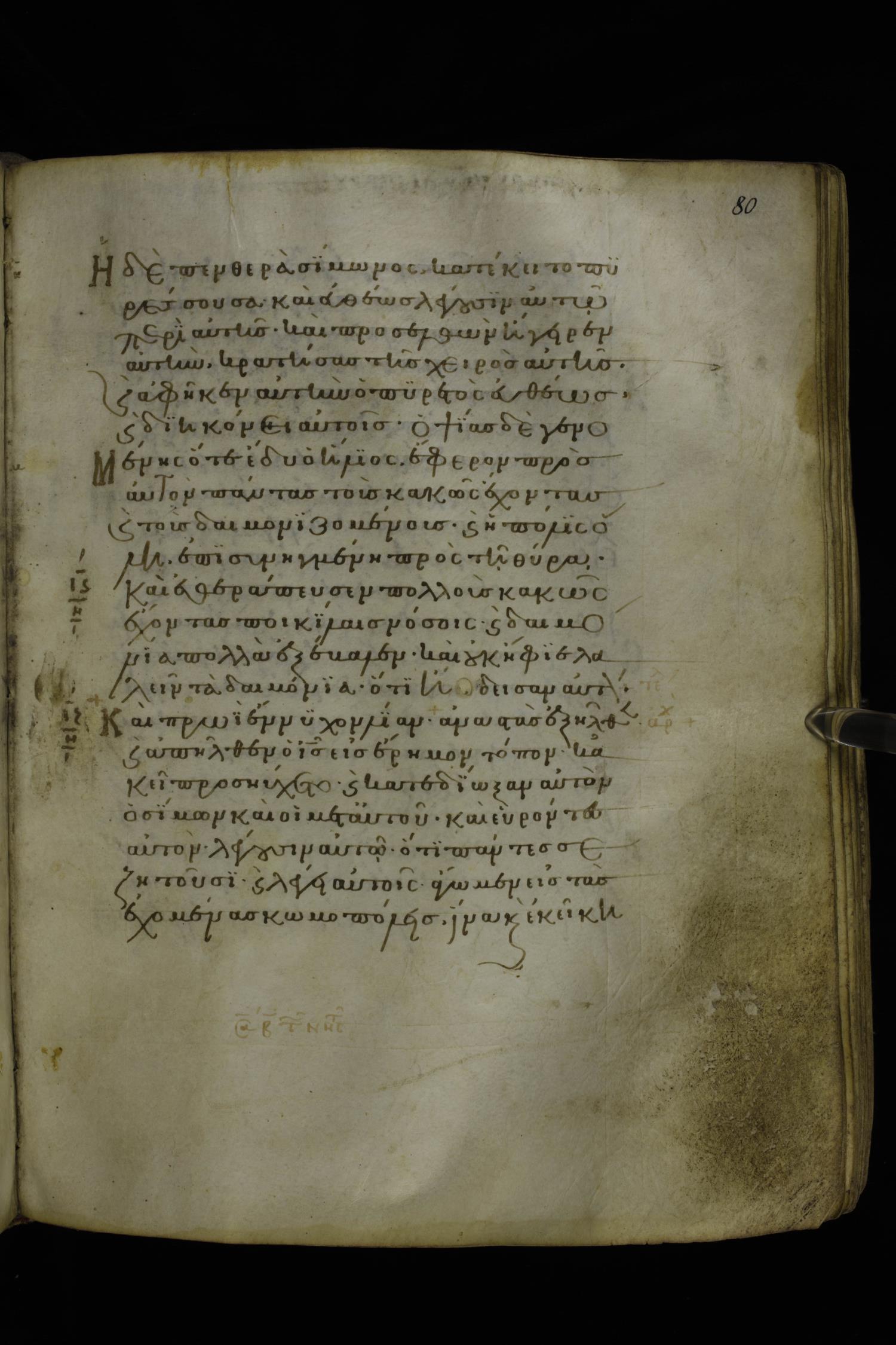 Twelfth century minuscule of the Gospels on parchment; 277 leaves, 1 column, 22 lines per column. Images were taken at the National Library of Greece in Athens.