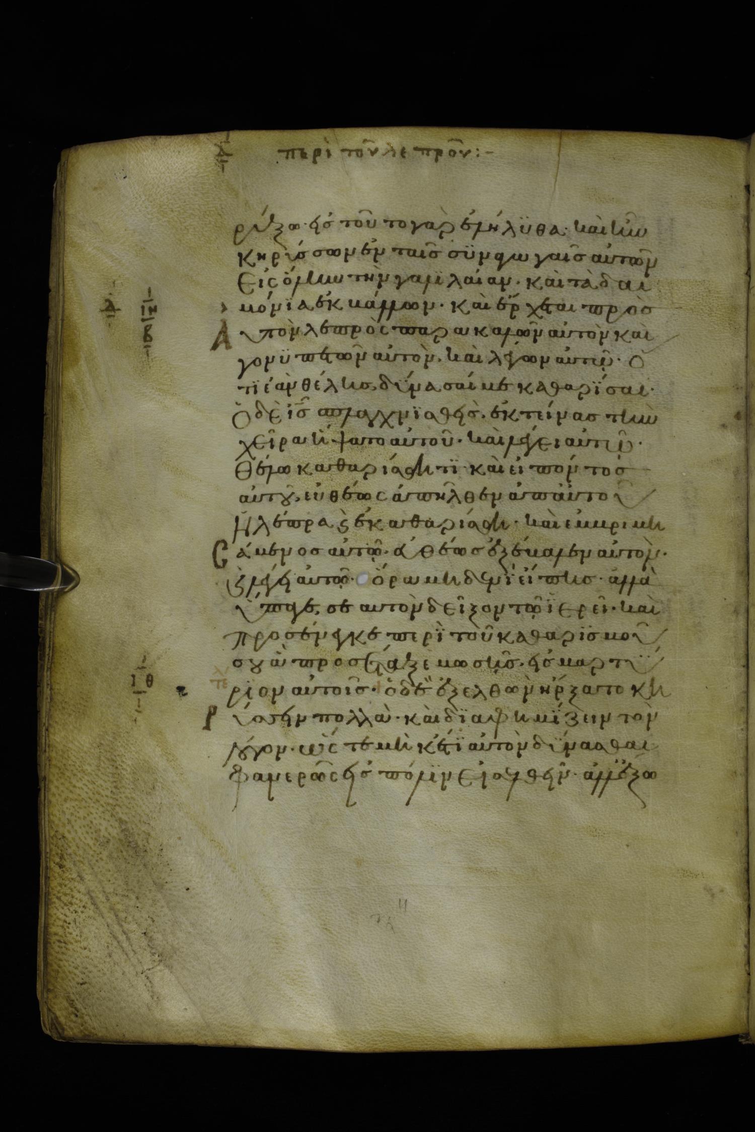 Twelfth century minuscule of the Gospels on parchment; 277 leaves, 1 column, 22 lines per column. Images were taken at the National Library of Greece in Athens.