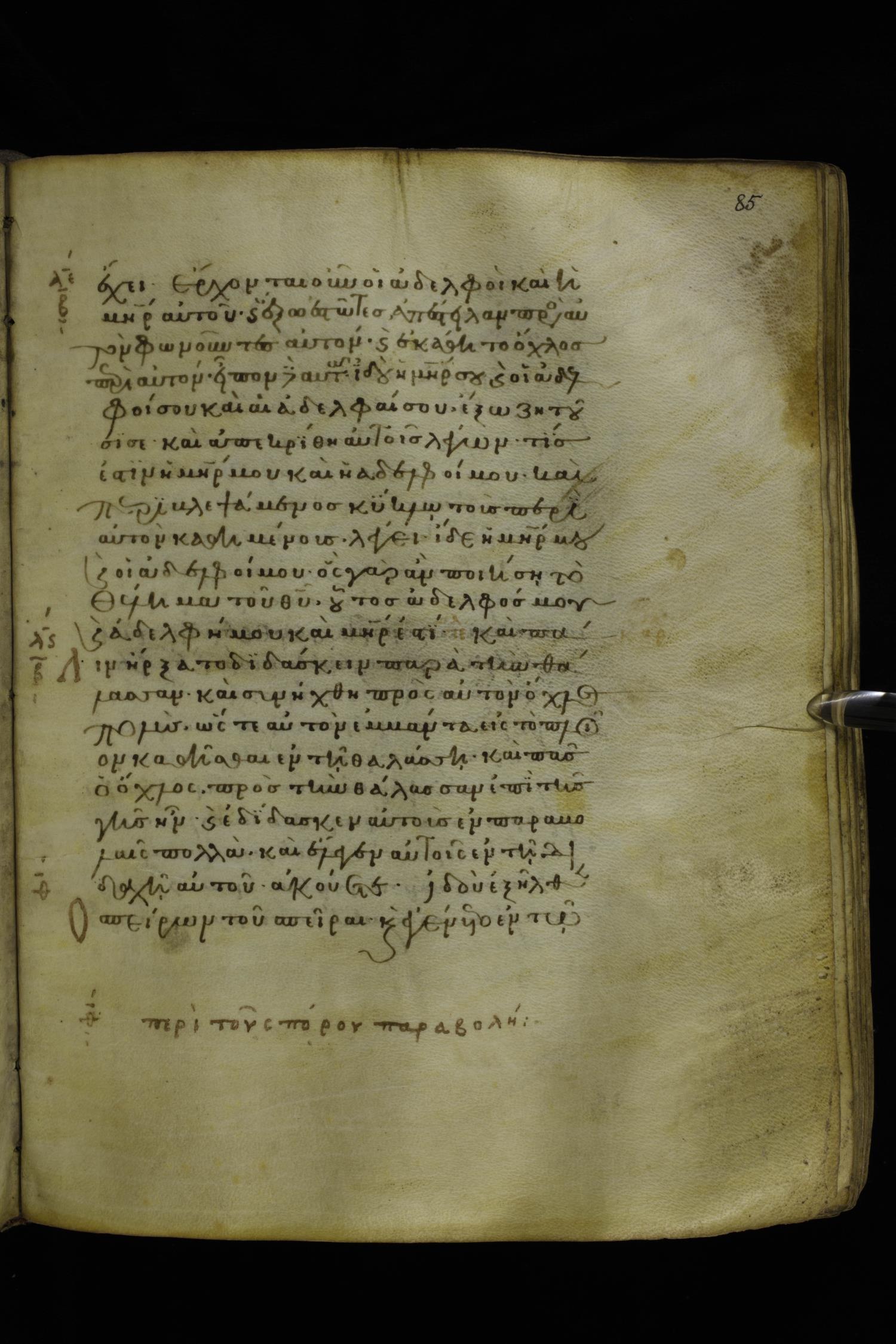 Twelfth century minuscule of the Gospels on parchment; 277 leaves, 1 column, 22 lines per column. Images were taken at the National Library of Greece in Athens.