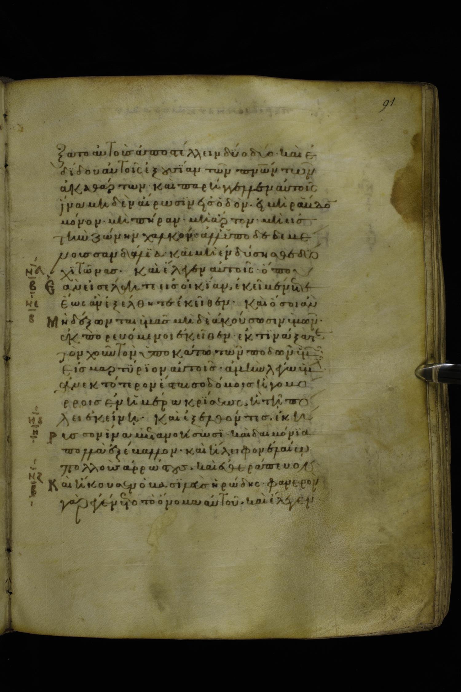 Twelfth century minuscule of the Gospels on parchment; 277 leaves, 1 column, 22 lines per column. Images were taken at the National Library of Greece in Athens.