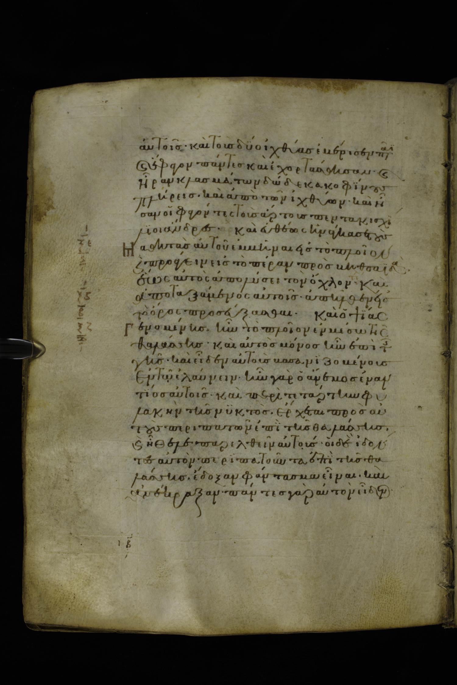 Twelfth century minuscule of the Gospels on parchment; 277 leaves, 1 column, 22 lines per column. Images were taken at the National Library of Greece in Athens.