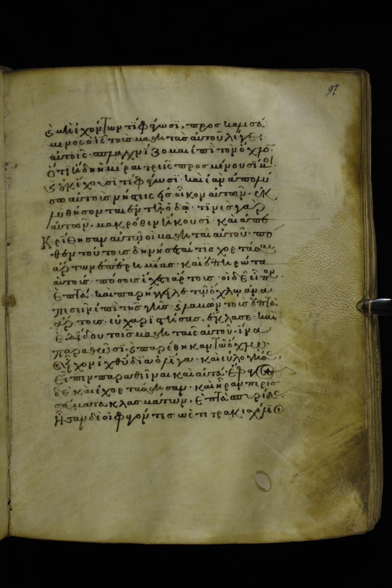Twelfth century minuscule of the Gospels on parchment; 277 leaves, 1 column, 22 lines per column. Images were taken at the National Library of Greece in Athens.
