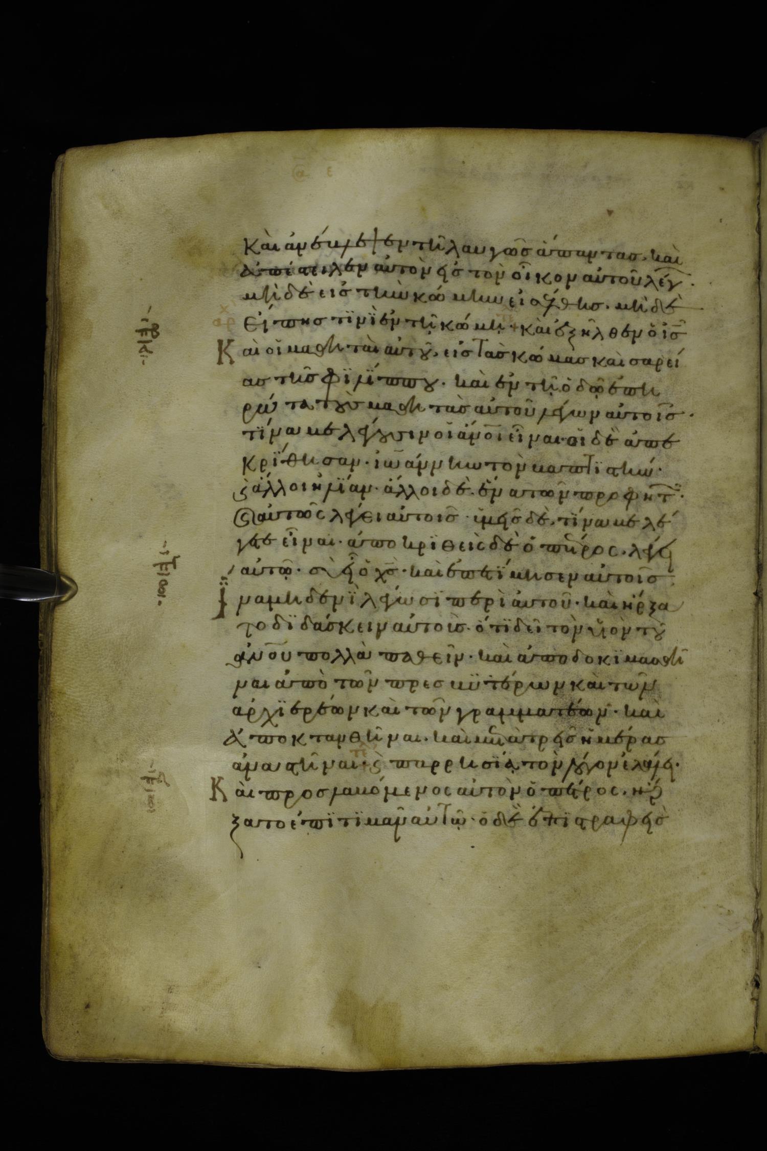 Twelfth century minuscule of the Gospels on parchment; 277 leaves, 1 column, 22 lines per column. Images were taken at the National Library of Greece in Athens.