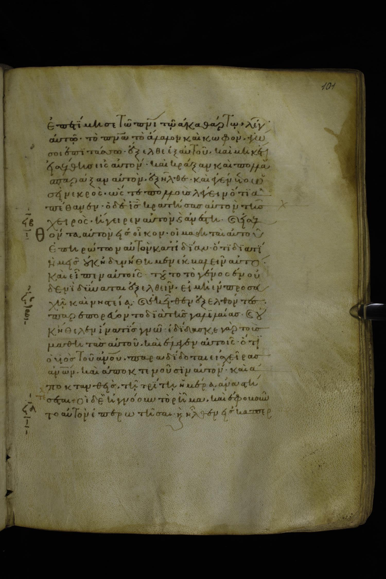 Twelfth century minuscule of the Gospels on parchment; 277 leaves, 1 column, 22 lines per column. Images were taken at the National Library of Greece in Athens.