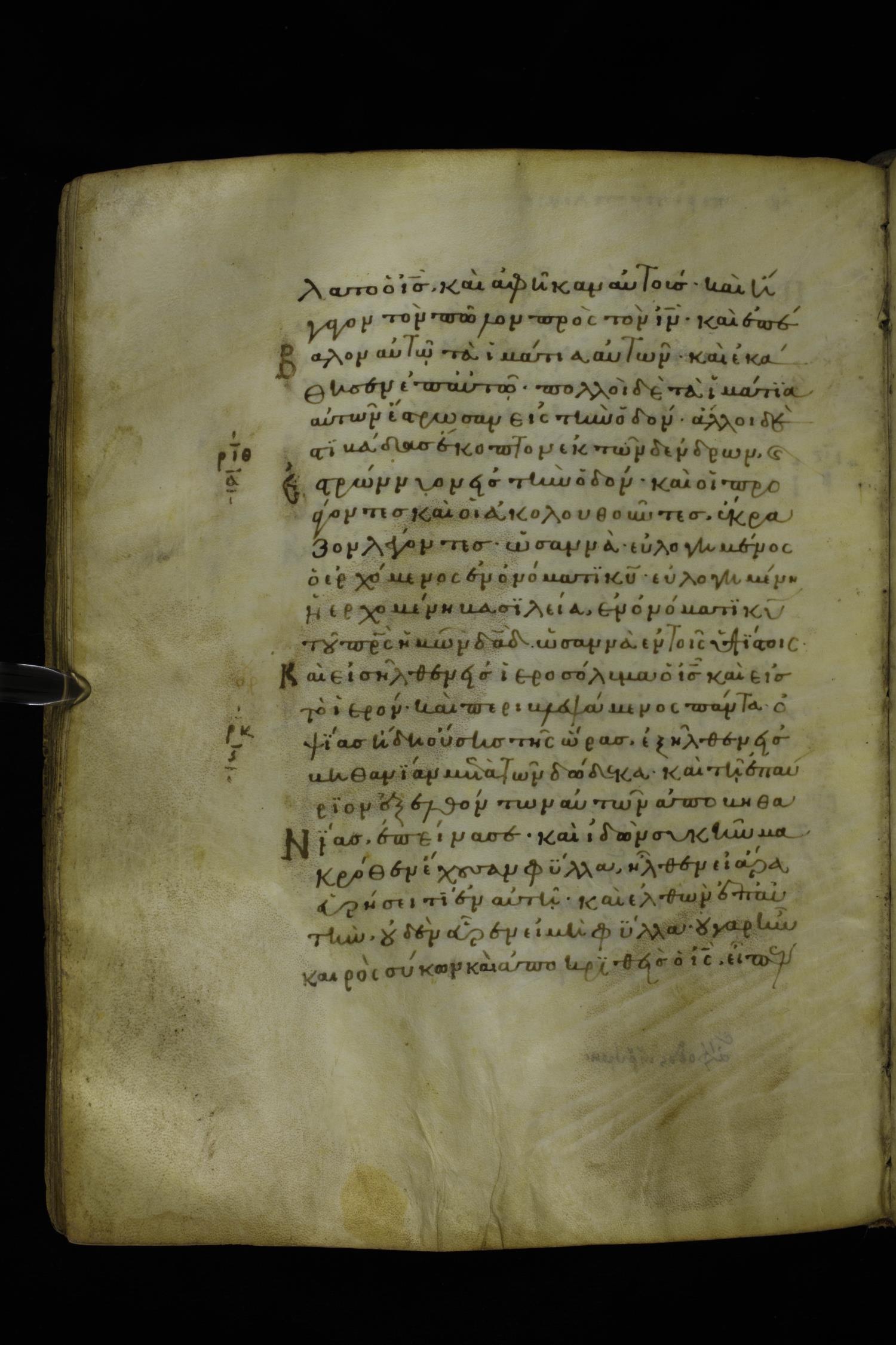 Twelfth century minuscule of the Gospels on parchment; 277 leaves, 1 column, 22 lines per column. Images were taken at the National Library of Greece in Athens.