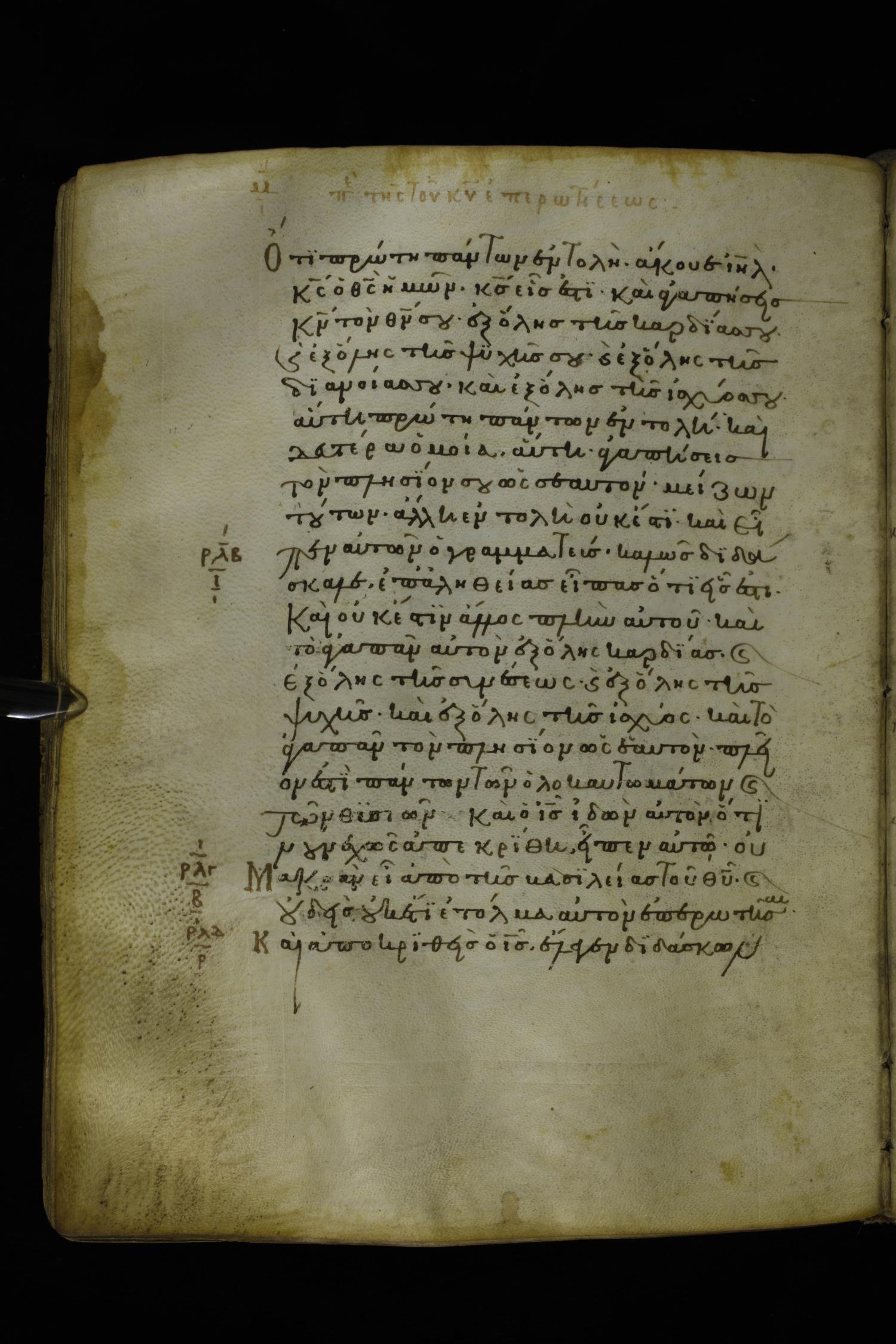 Twelfth century minuscule of the Gospels on parchment; 277 leaves, 1 column, 22 lines per column. Images were taken at the National Library of Greece in Athens.