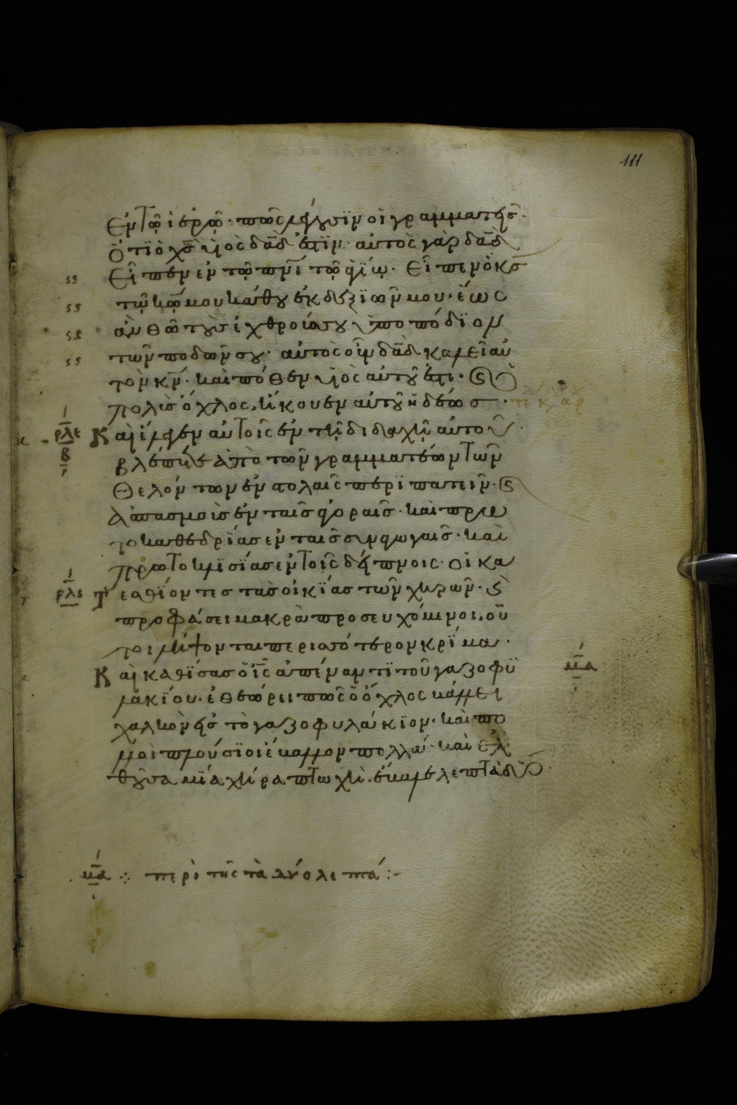 Twelfth century minuscule of the Gospels on parchment; 277 leaves, 1 column, 22 lines per column. Images were taken at the National Library of Greece in Athens.