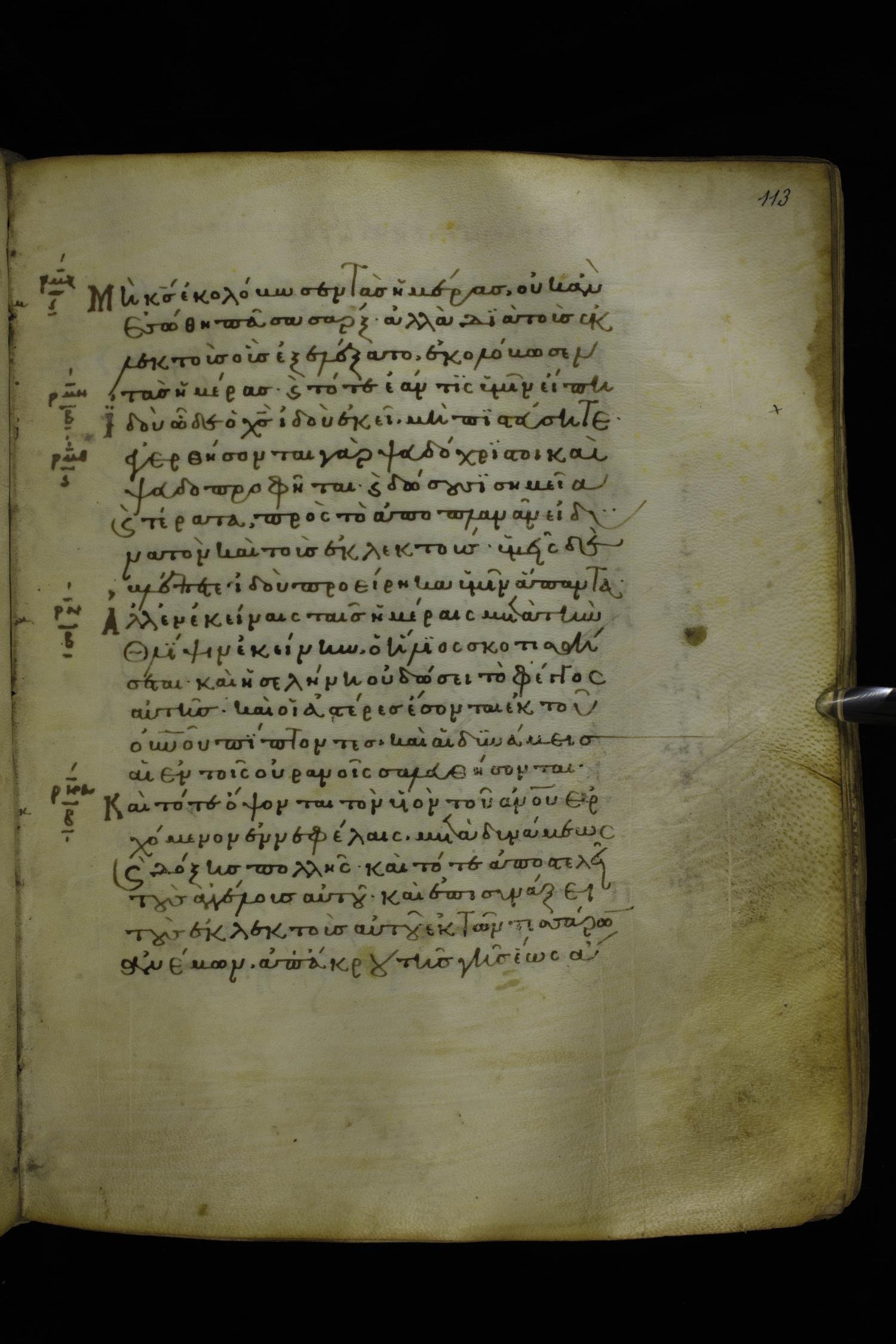 Twelfth century minuscule of the Gospels on parchment; 277 leaves, 1 column, 22 lines per column. Images were taken at the National Library of Greece in Athens.