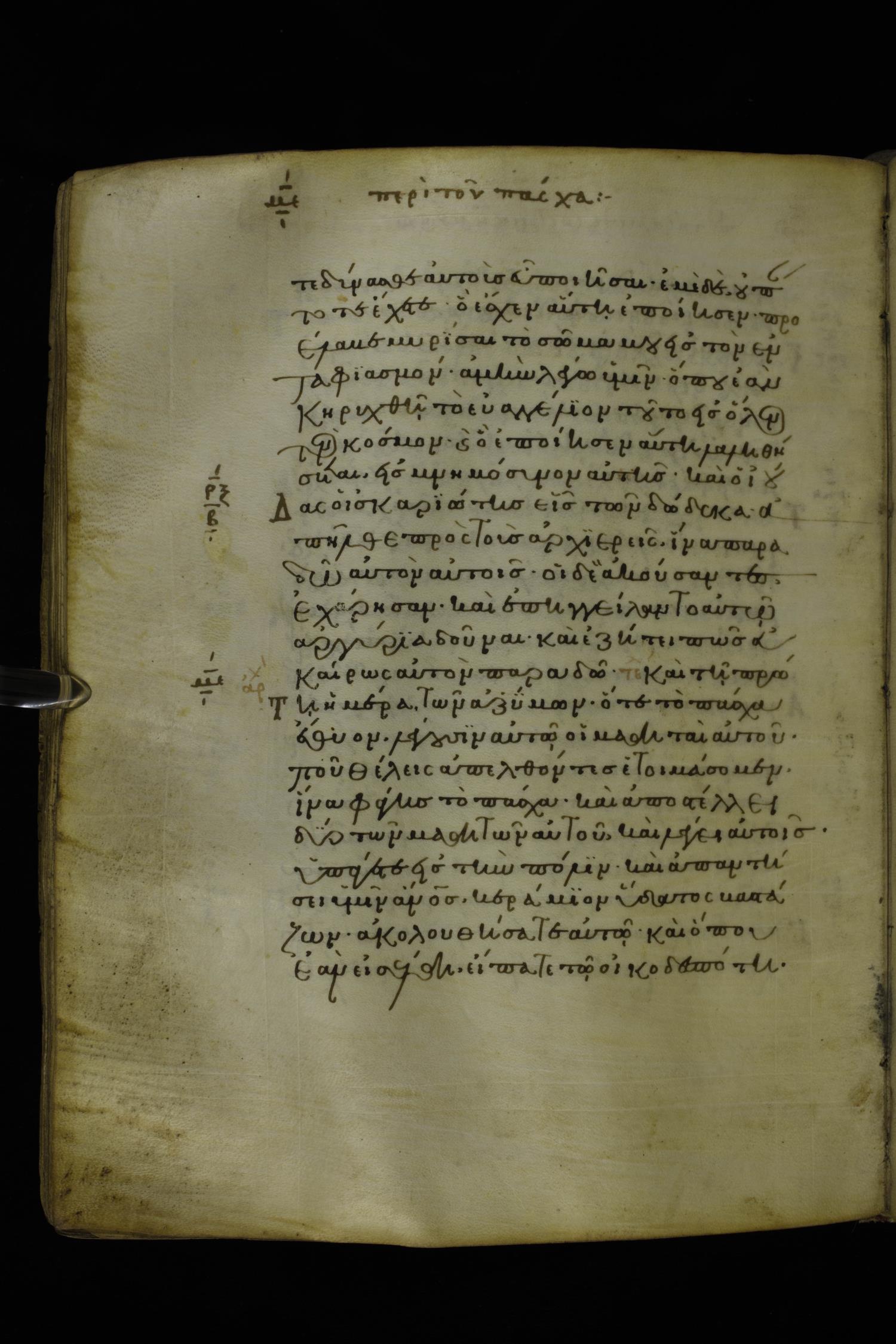 Twelfth century minuscule of the Gospels on parchment; 277 leaves, 1 column, 22 lines per column. Images were taken at the National Library of Greece in Athens.