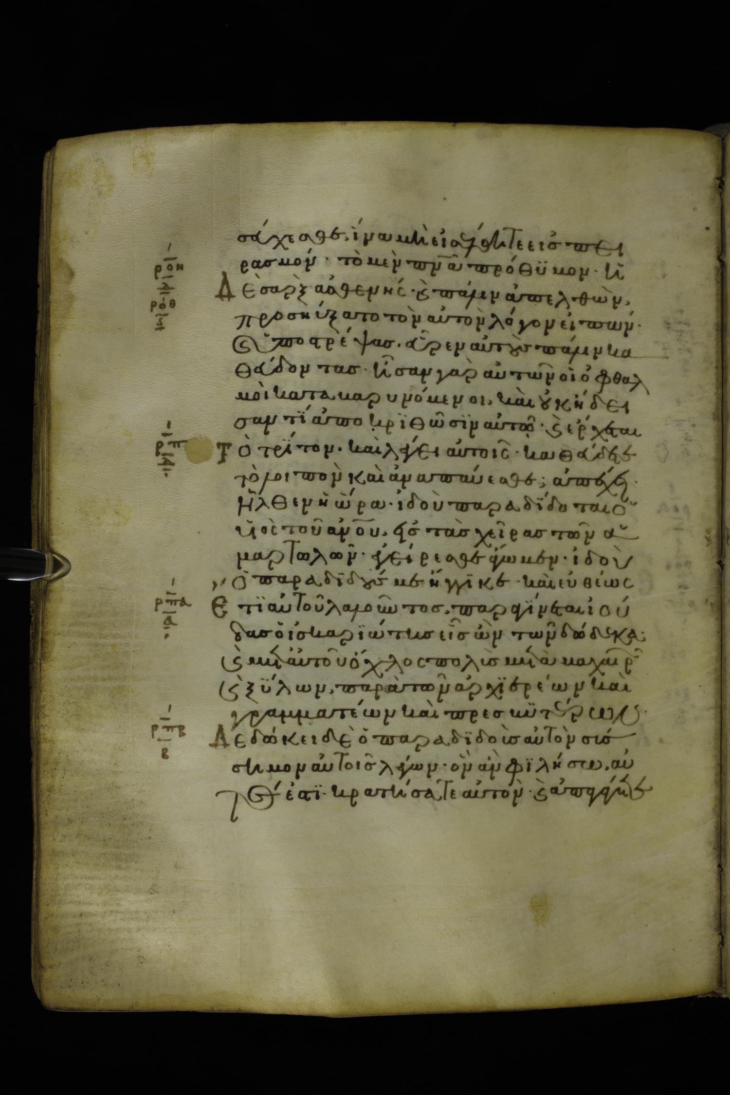 Twelfth century minuscule of the Gospels on parchment; 277 leaves, 1 column, 22 lines per column. Images were taken at the National Library of Greece in Athens.