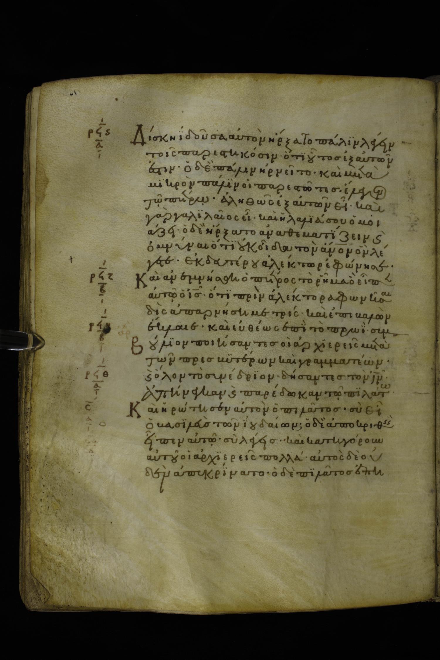 Twelfth century minuscule of the Gospels on parchment; 277 leaves, 1 column, 22 lines per column. Images were taken at the National Library of Greece in Athens.
