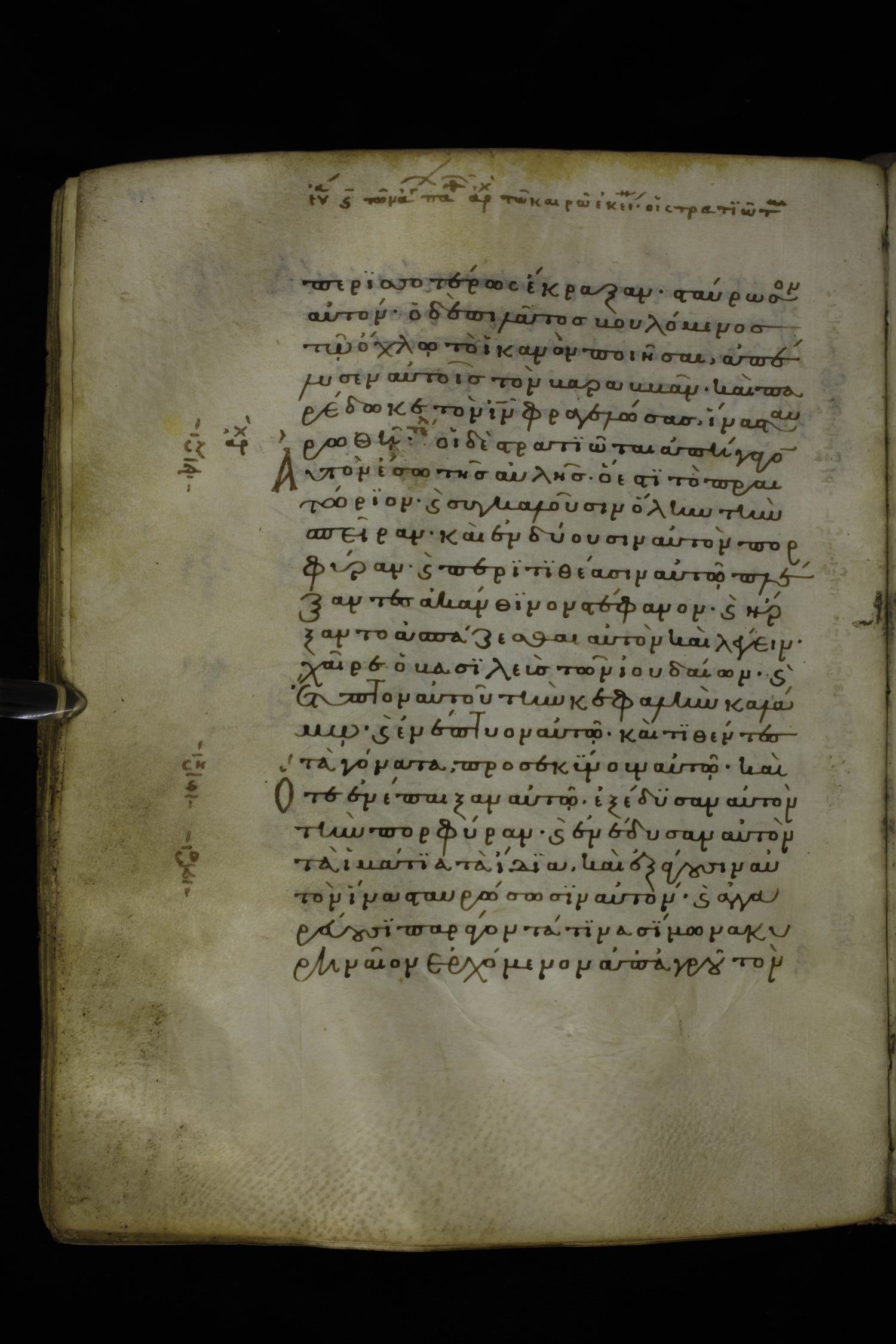 Twelfth century minuscule of the Gospels on parchment; 277 leaves, 1 column, 22 lines per column. Images were taken at the National Library of Greece in Athens.